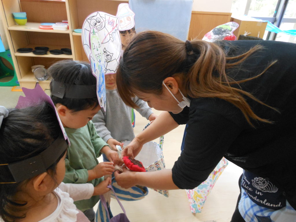 「おかしくれないといたずらするぞー!」と言ってお菓子をもらうハロウィンごっこをしました😊
