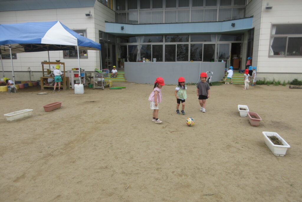 ボールを追いかけながらみんなでサッカーをしました!
