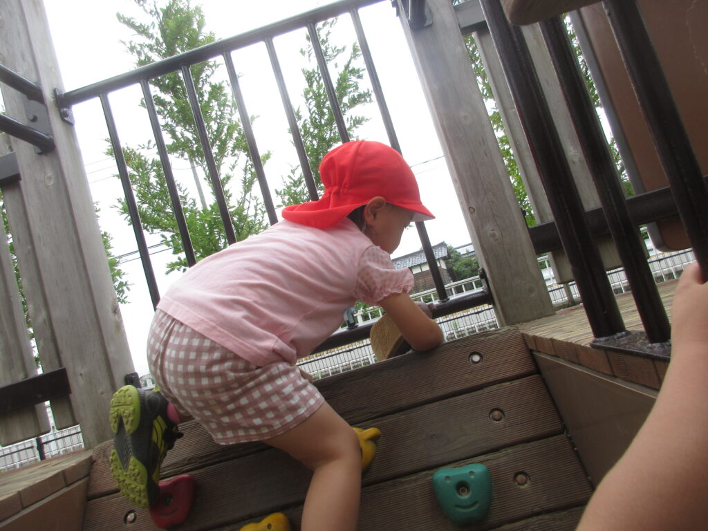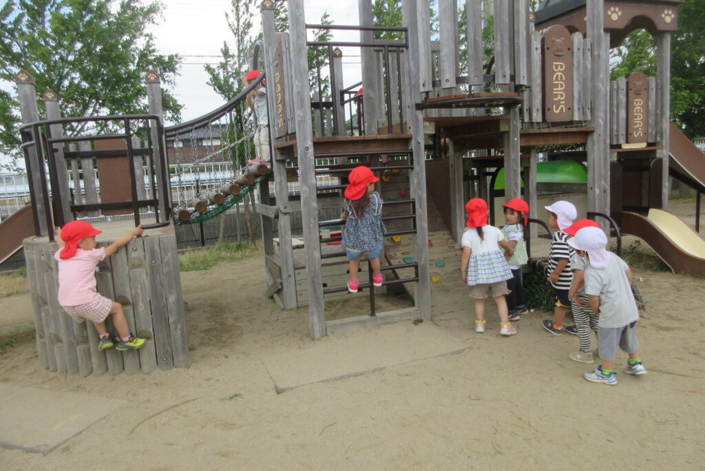 大型遊具の前に靴が落ちていたのを見つけたお友だちは落ちていた靴を片手に登って届けてあげるようです☺