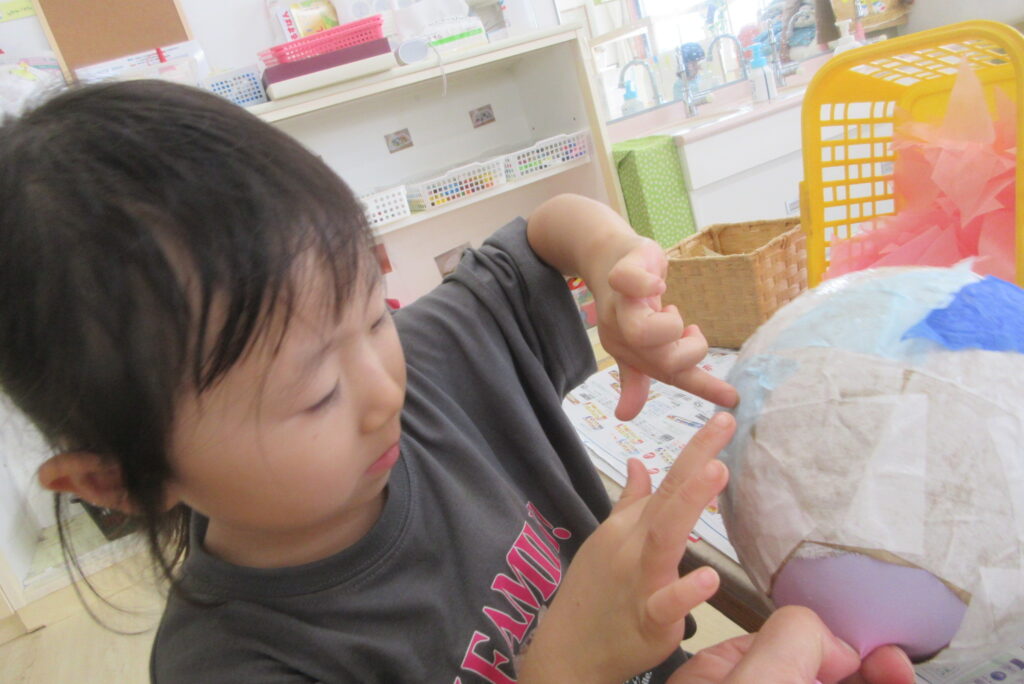 4月の頃から一列になったり、手を繋いで二列になったりと「集団で並ぶ、活動をする」ということが日中の活動を通して、子どもたちにとって身近で当たり前のものになったんだなと思い、成長を感じました。ふとした時に保育者も予想できなかった活動が展開されたり、姿が見られたりします。今後も子どもたちの興味関心の芽を育めるように日中過ごせたらと思います。