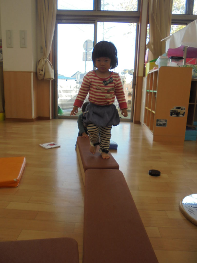 出来立てほやほやの跨線橋を「♪ガタンゴトーン♪」と口ずさみながら走らせたり、ソフト積み木の上を歩いたり…