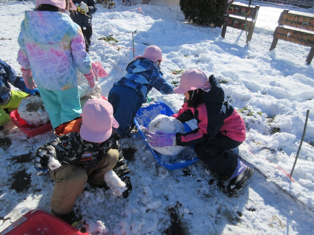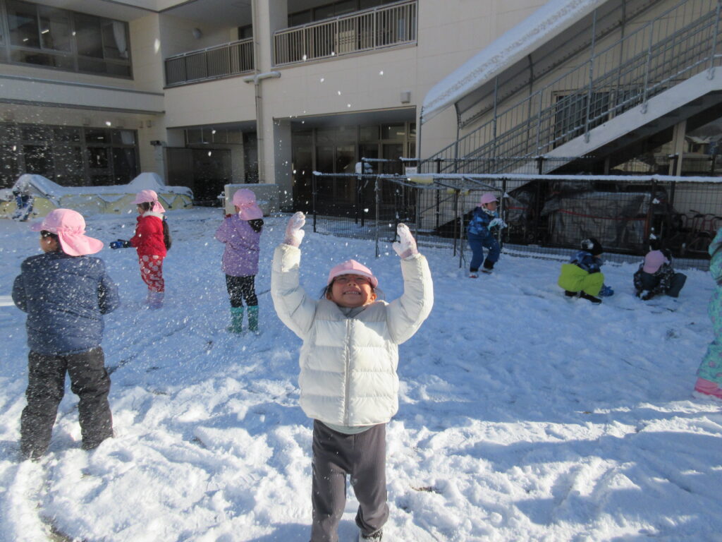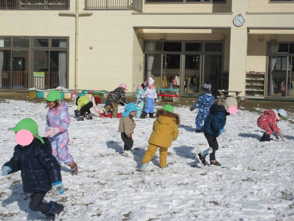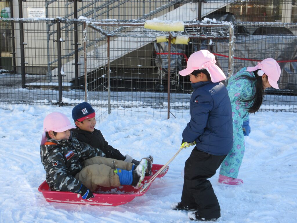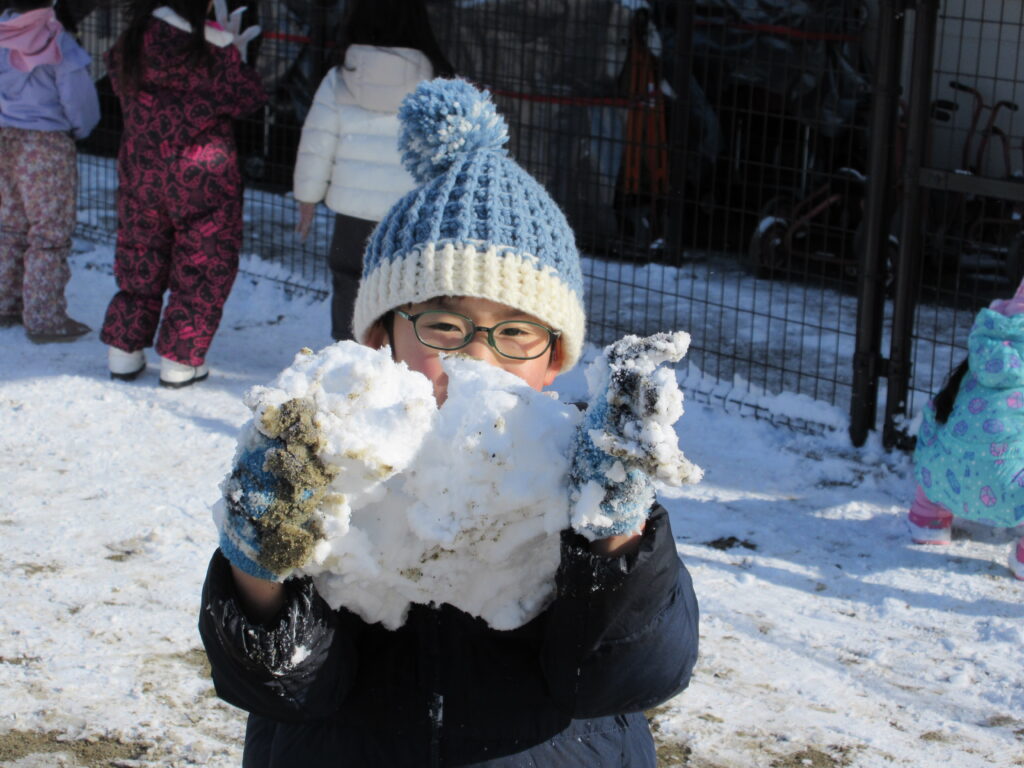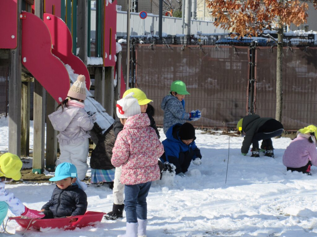 子ども達にとっては待ちに待った積雪🥰朝から「今日お外行く?」「雪で遊べる?」と気になって仕方がなかった子ども達です。園庭に出ると、ソリや雪合戦、雪だるま作りなどそれぞれが好きな遊びを目一杯楽しんでいました✨