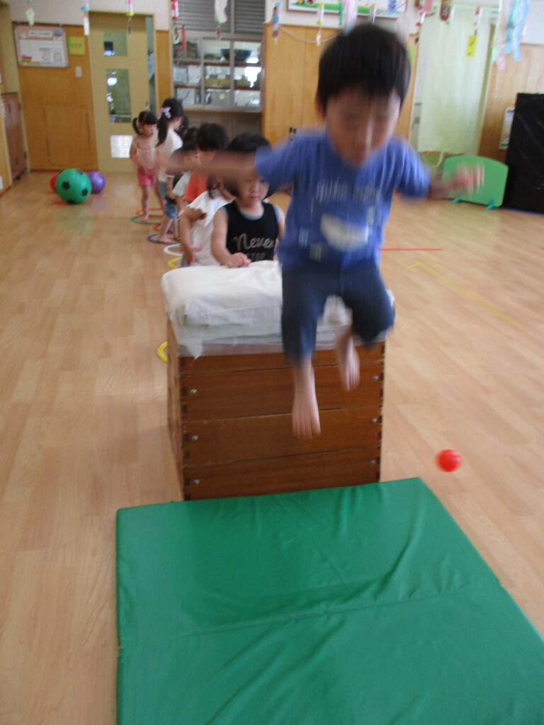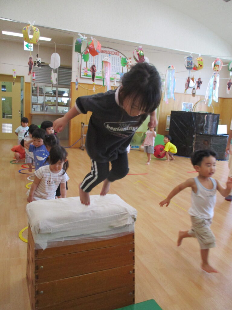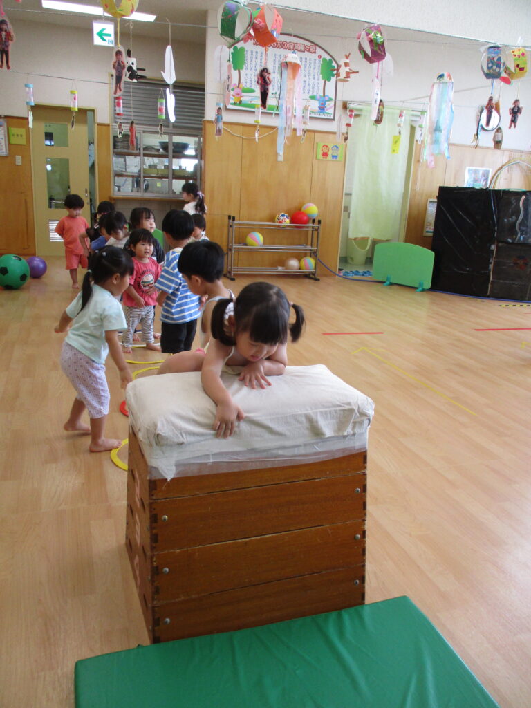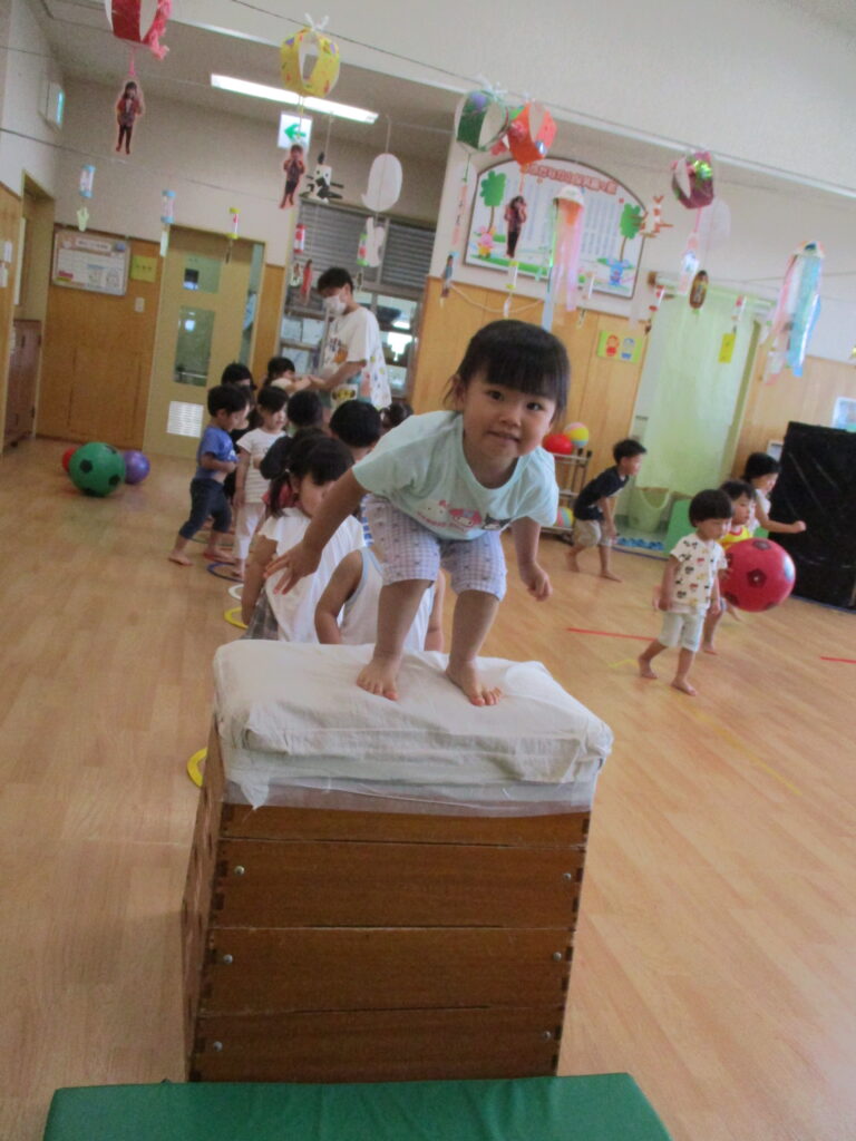 以前、園庭遊びのおたよりにてテラスへ登るためのはしごについて、お伝えをしました。まだまだ登ることは難しいのですが、子どもたちの挑戦する姿を応援したい…!よし、保育園で跳び箱を使って特訓だ~!!