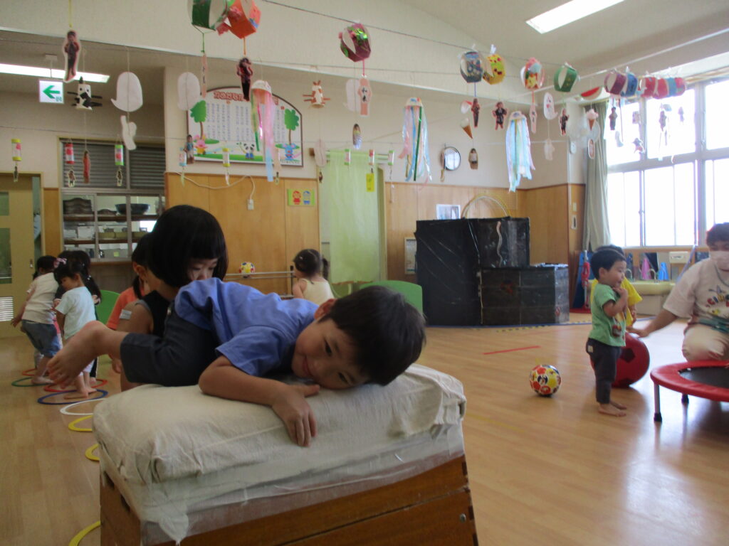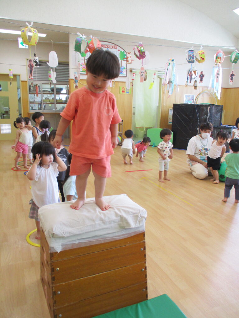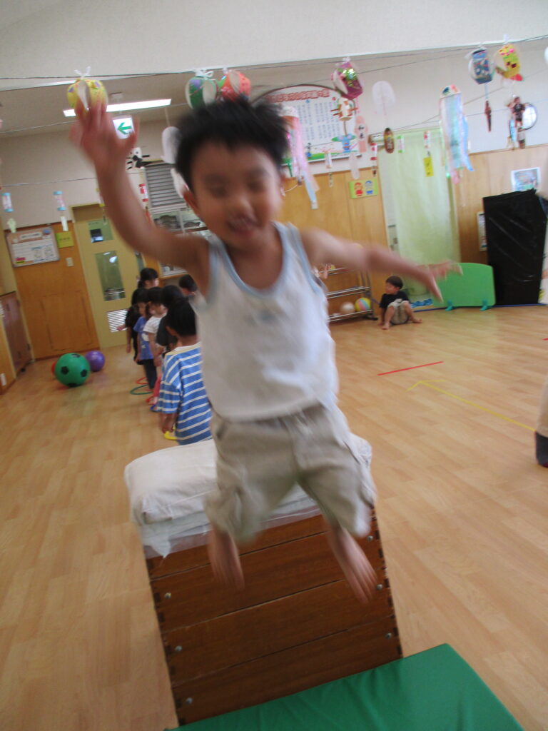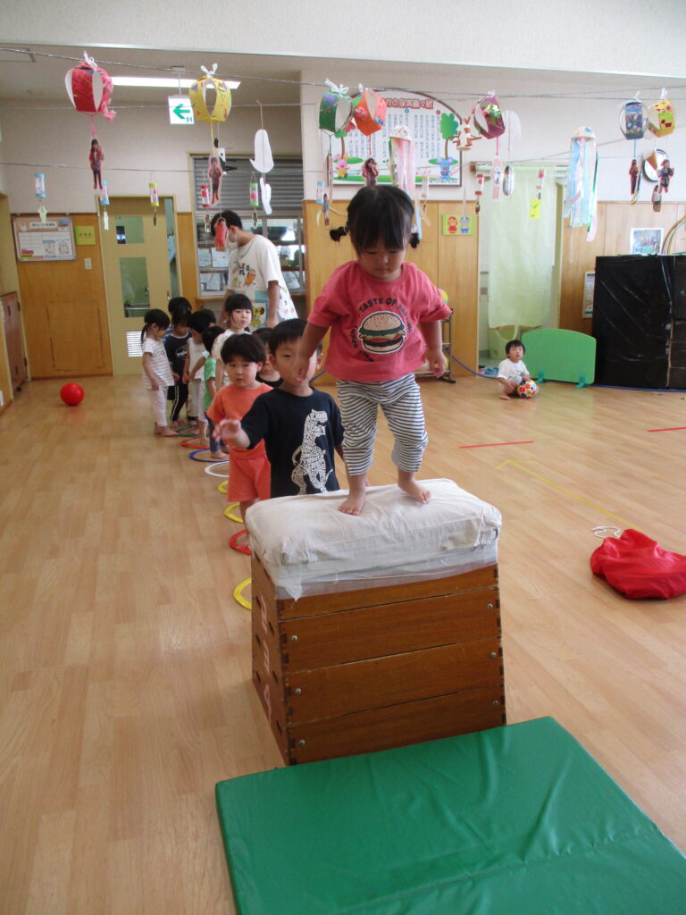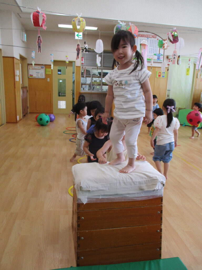 以前、園庭遊びのおたよりにてテラスへ登るためのはしごについて、お伝えをしました。まだまだ登ることは難しいのですが、子どもたちの挑戦する姿を応援したい…!よし、保育園で跳び箱を使って特訓だ~!!