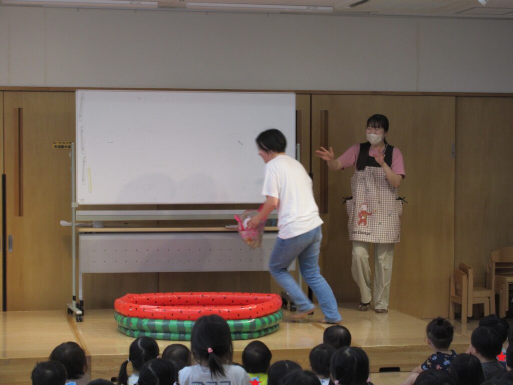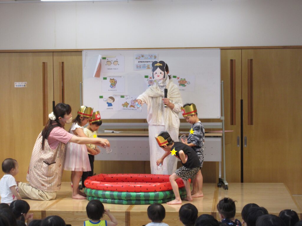 水遊びの約束事を寸劇や○×クイズで学んだ後、水神様が登場しました🧚