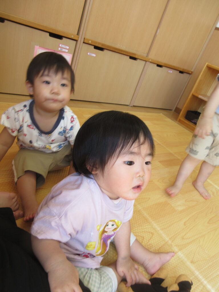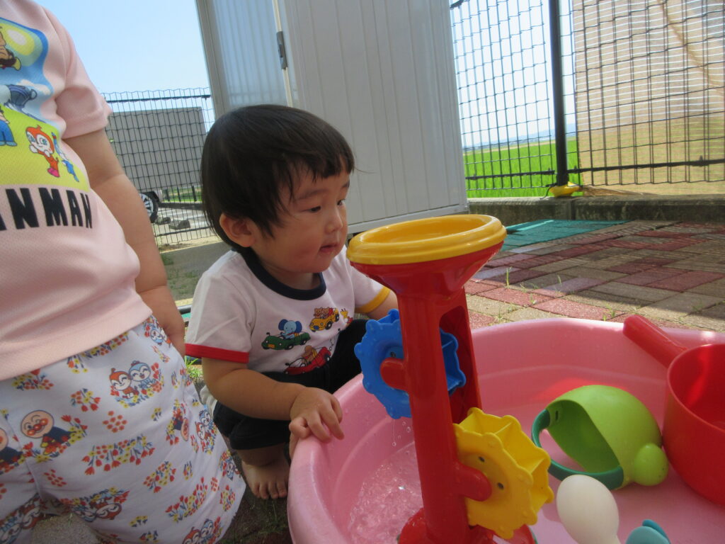 初めての水遊びにドキドキのお友だち。保育者が水をぐるぐるとかき混ぜたりぱちゃぱちゃと跳ねさせてみたりするとドキドキしながらも「面白そうかも」「ちょっとやってみようかな」の気持ちが生まれ、水に触れてみるお友達もいました!