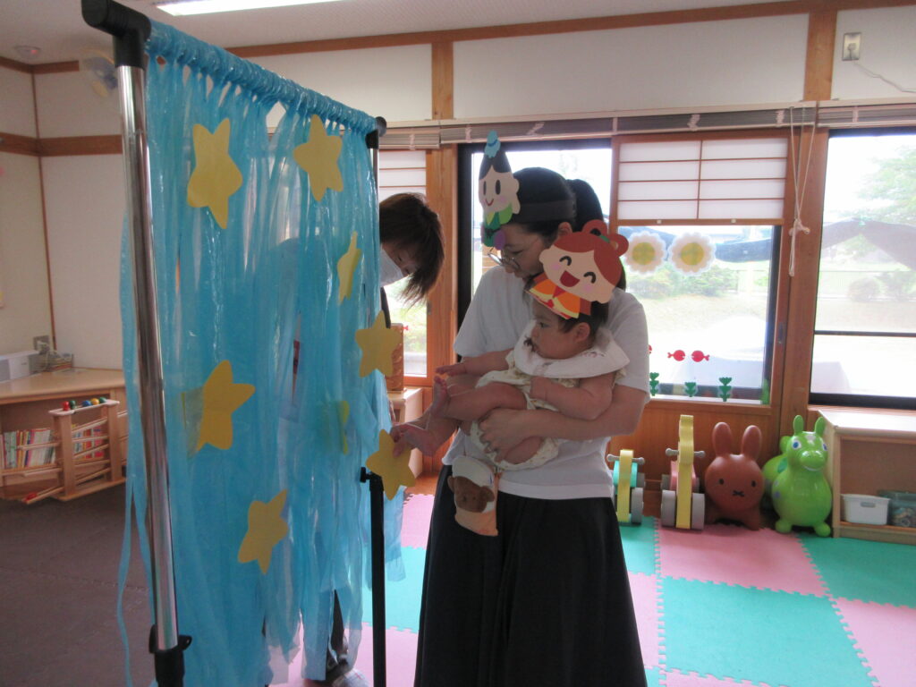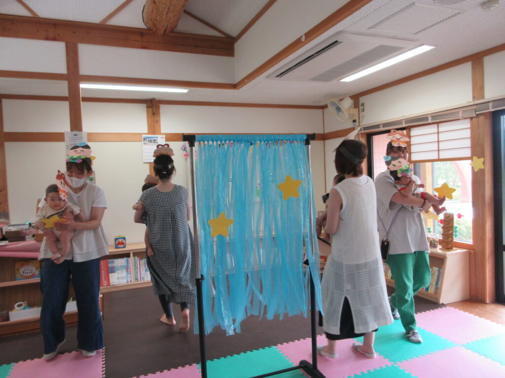 織姫様と彦星様になって、お星さま探しゲームを親子でお面をかぶって、変身して遊びました。