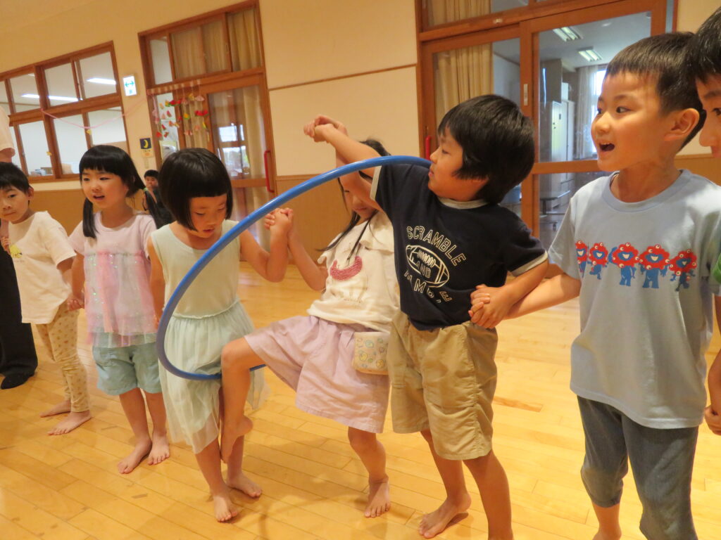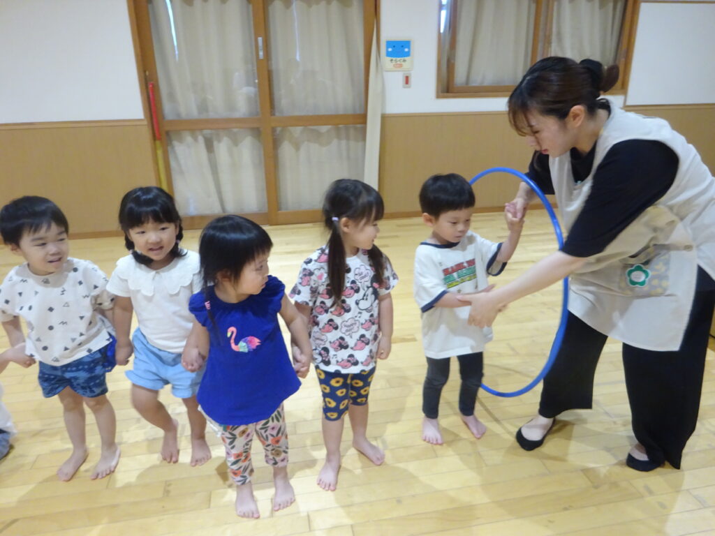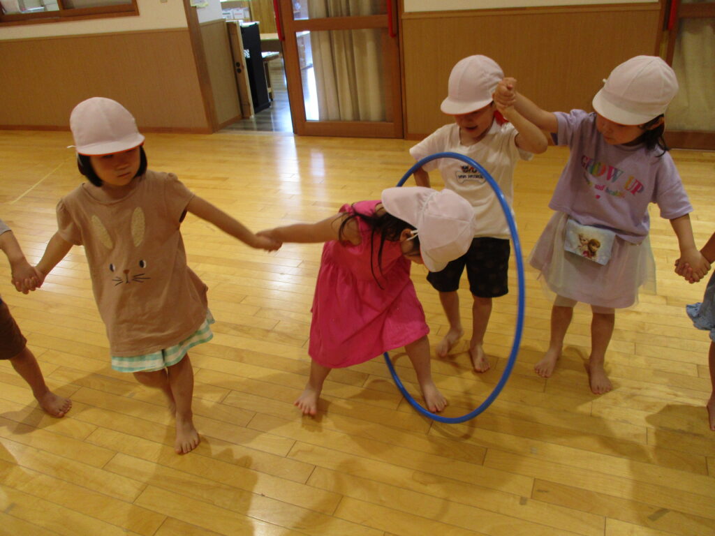 保護者の方々も一緒に輪に入っていただき、うきわをくぐってもらいました!ご参加ありがとうございました♪