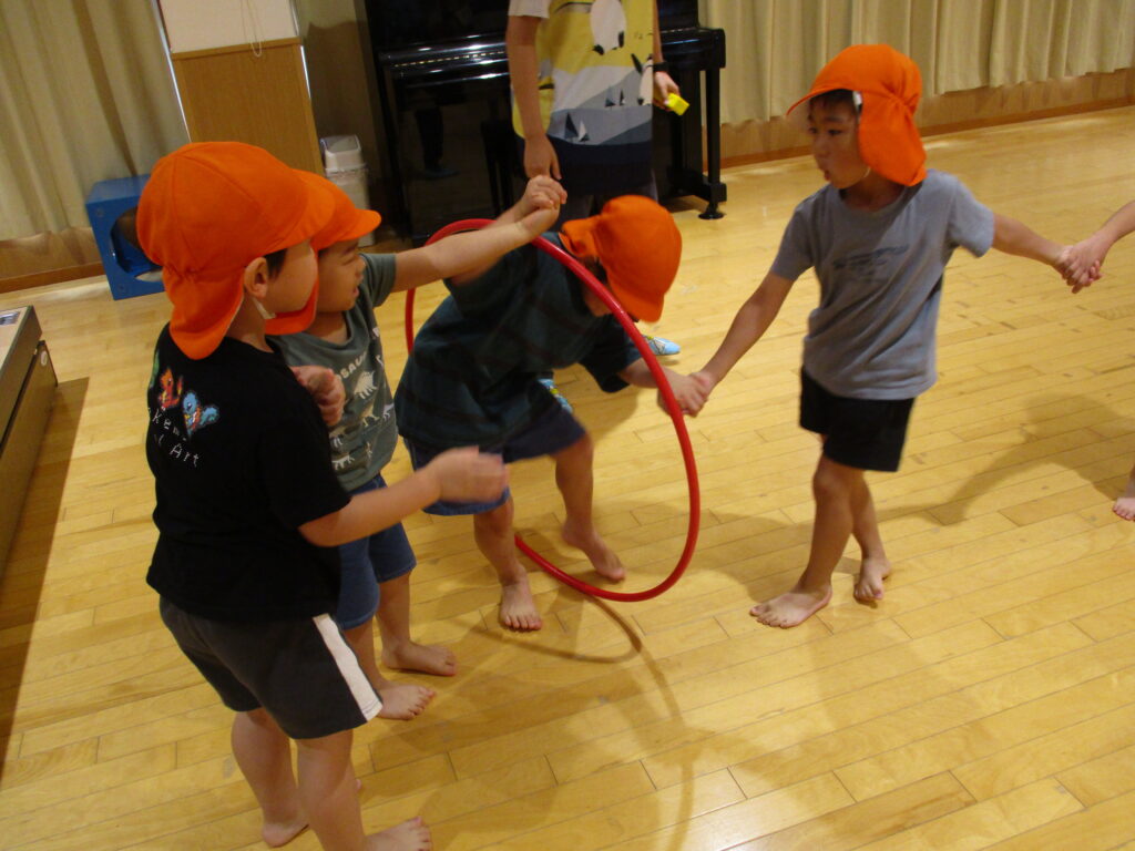今月のお楽しみはプール開きもしたという事で『うきわリレー』です!フラフープをうきわに見立ててお友だちと手を繋いだままの状態でどんどん送っていきます。