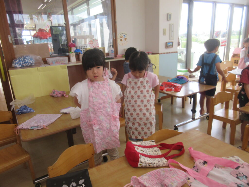 エプロンの後ろのボタンが難しいお友だちのためにさりげなく手を貸す優しい姿が・・・。子どもが自発的に行った行動に担任も思わず脱帽でした👒