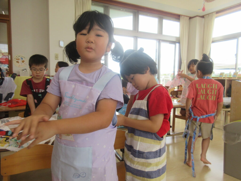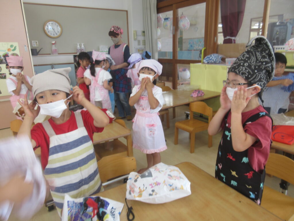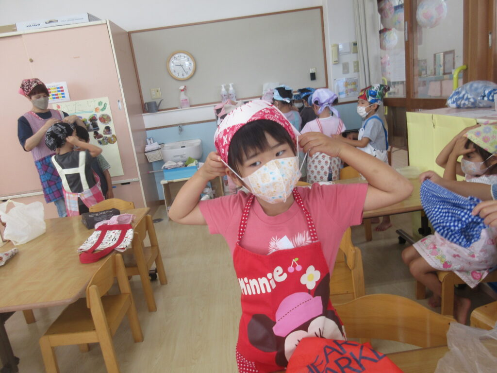まずはエプロン、三角巾、マスクを身に付けます。保護者の皆様、ご用意をありがとうございました!!
