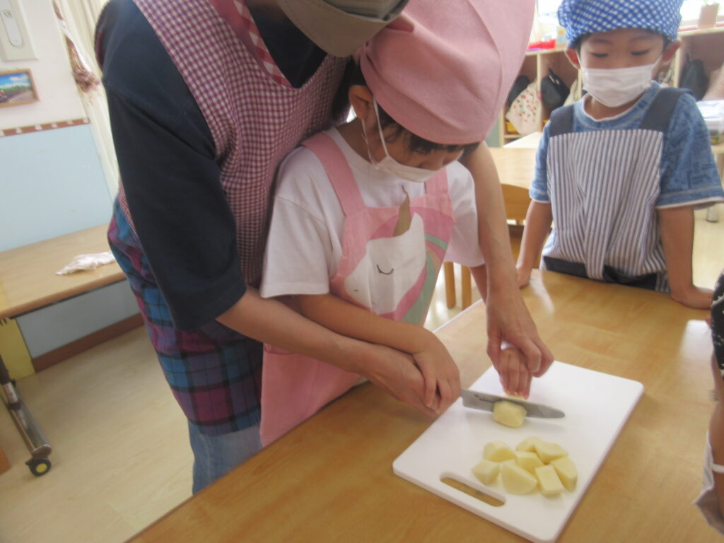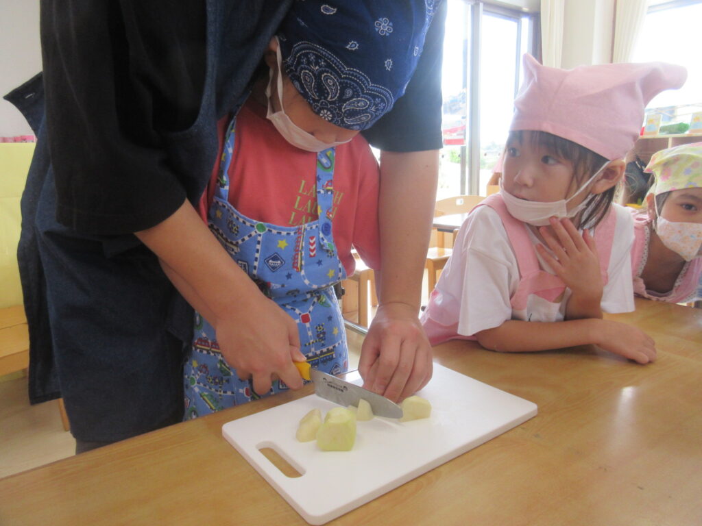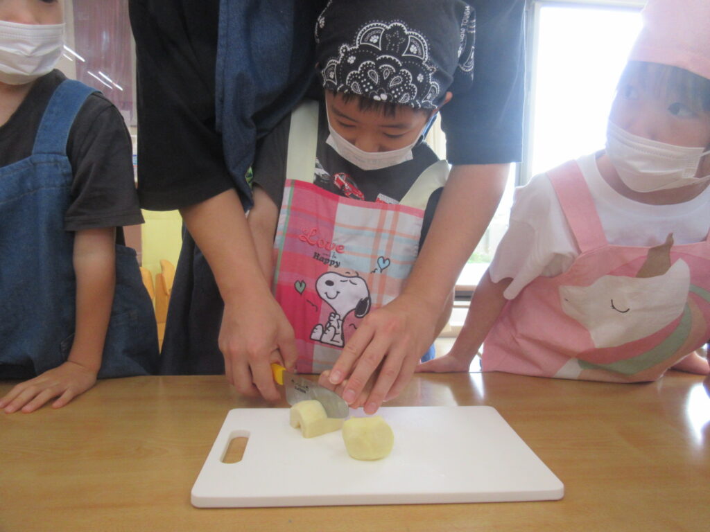 調理の際は「つぎはどうなるの!」「切るとき固い!」「いいにおいする!」と五感で不思議や発見を感じ、ワクワクとした期待感と、刃物を扱うことから少しの緊張感を持ちながら楽しんでいました。