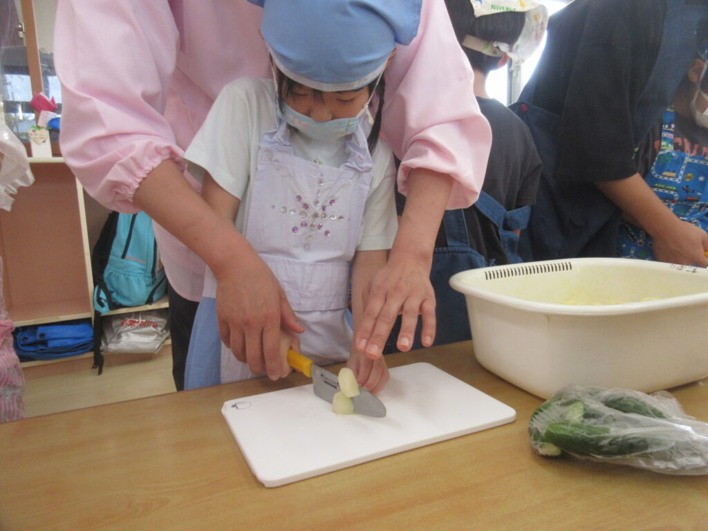 夕涼み会では調理の際に野菜を包丁で切るという工程があります。夕涼み会ではじめて包丁を扱うのではなく、前段階として食材の調理法を知ったり、調理器具の扱い方を知ることができるようにといったねらいも今回の活動には含まれています👍