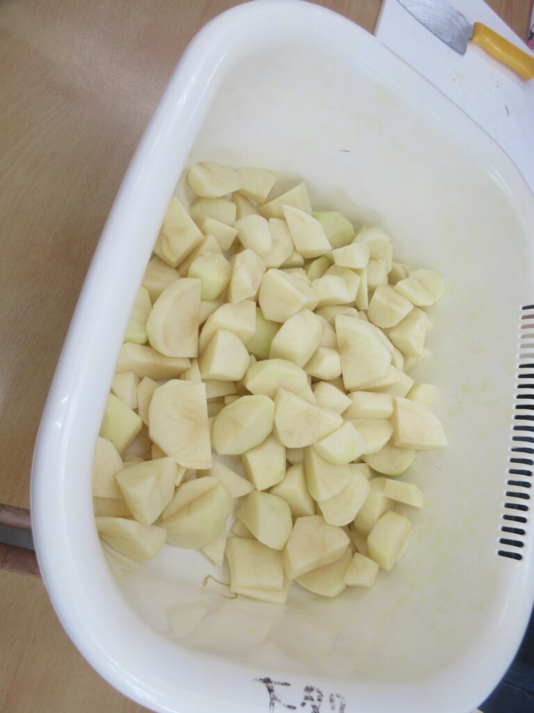 切り終えてから20分後、じゃがいもを蒸す工程が終了しました!!(この20分の隙間時間で、子どもたちと言葉について考える時間を設けました。その様子はまたどこかでお伝えできたらと思います・・・!)
