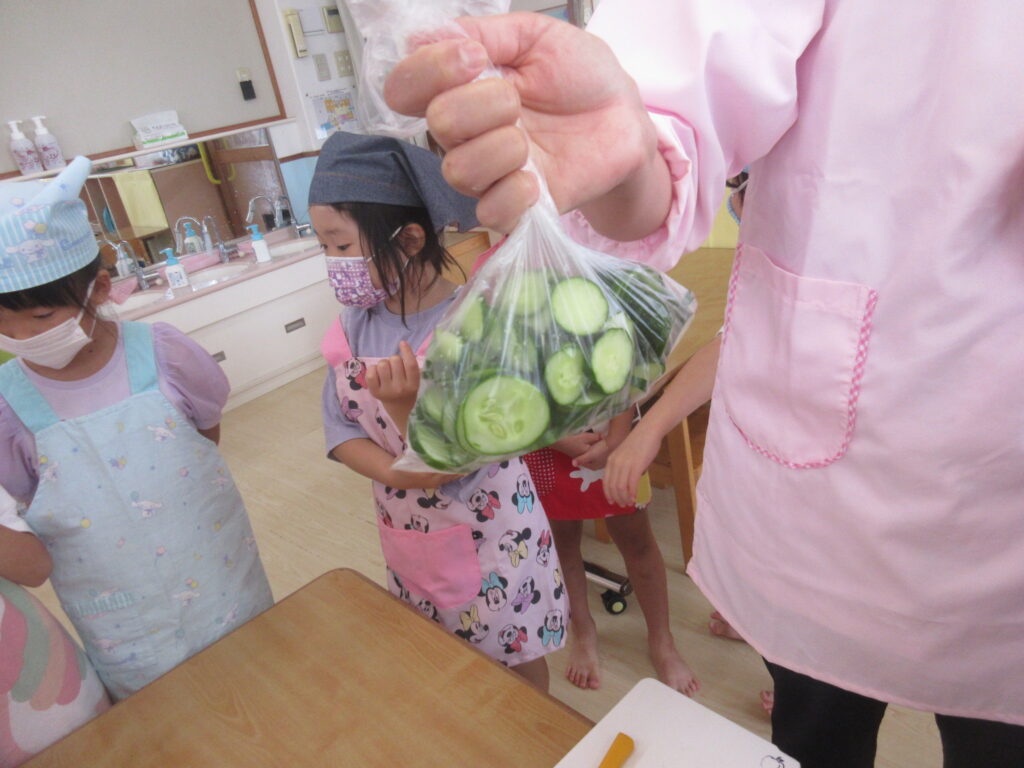 ポテトサラダに使用する具材として2歳児わかば組さんが育てているきゅうりをいただきました👏もちろんきゅうりも1人3カットずつ、薄めに切りました🥒