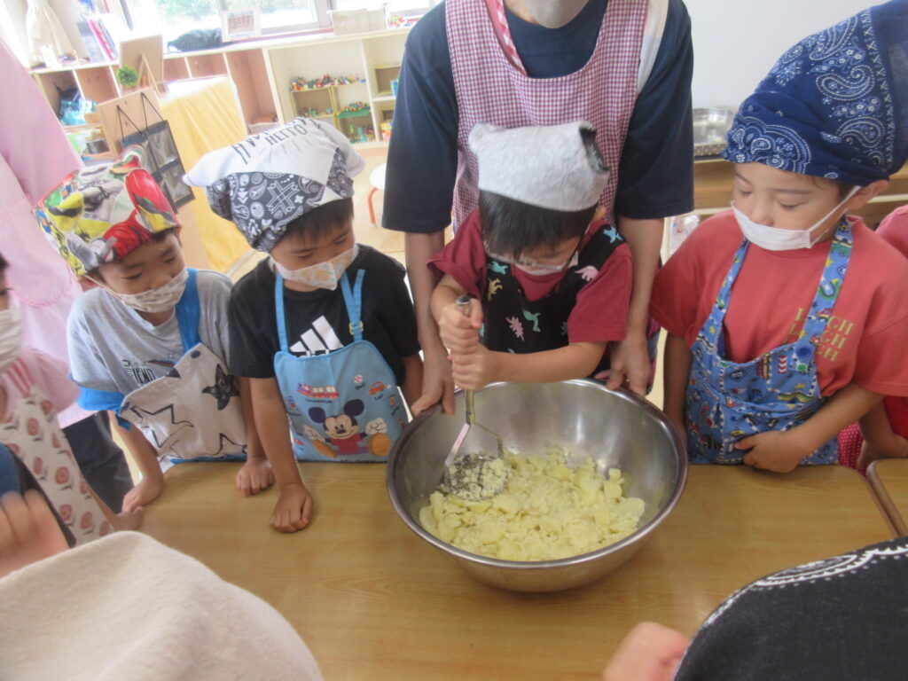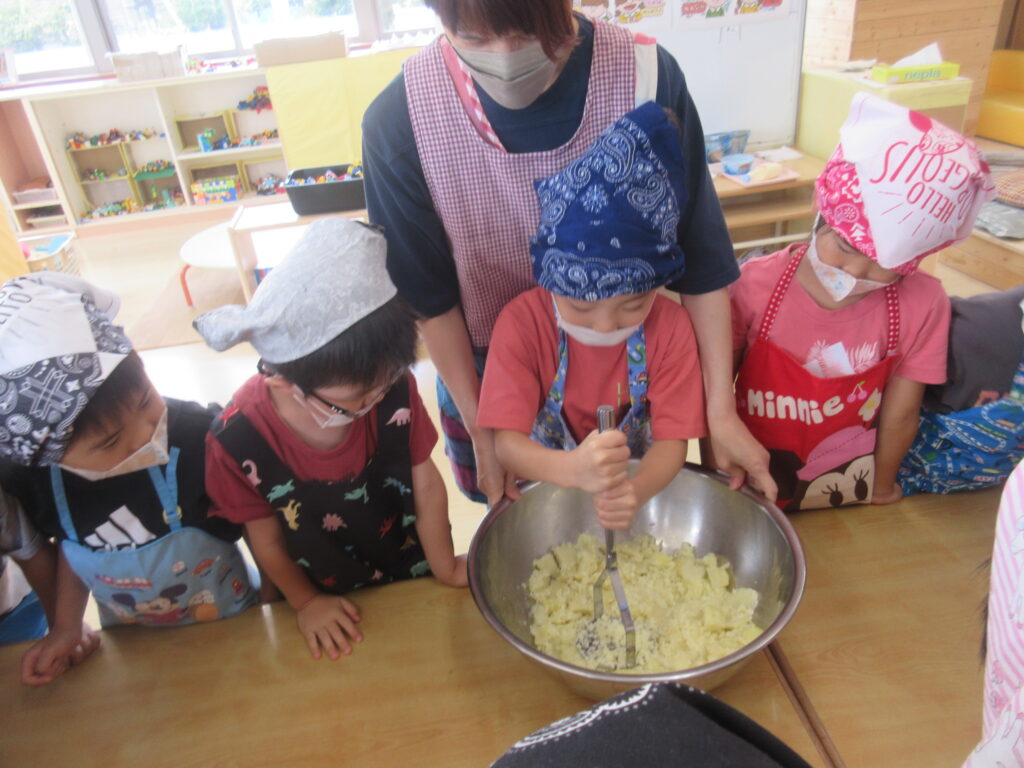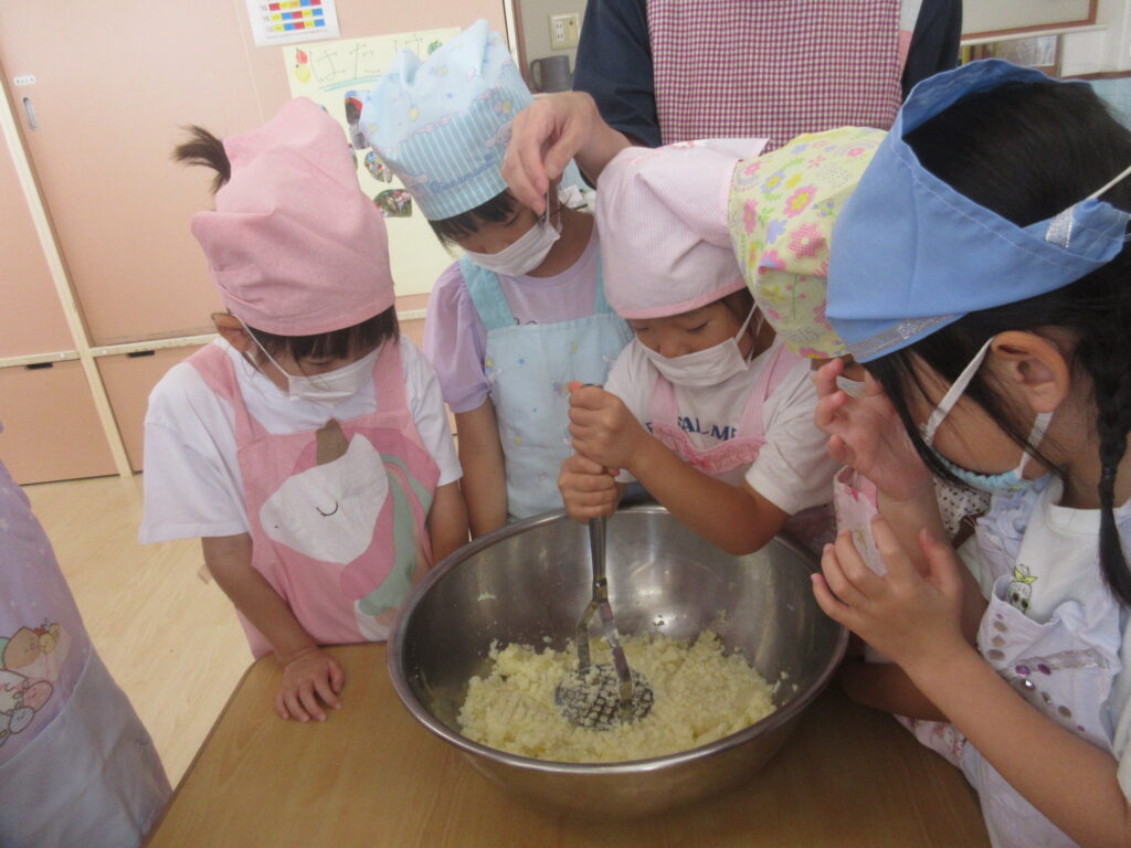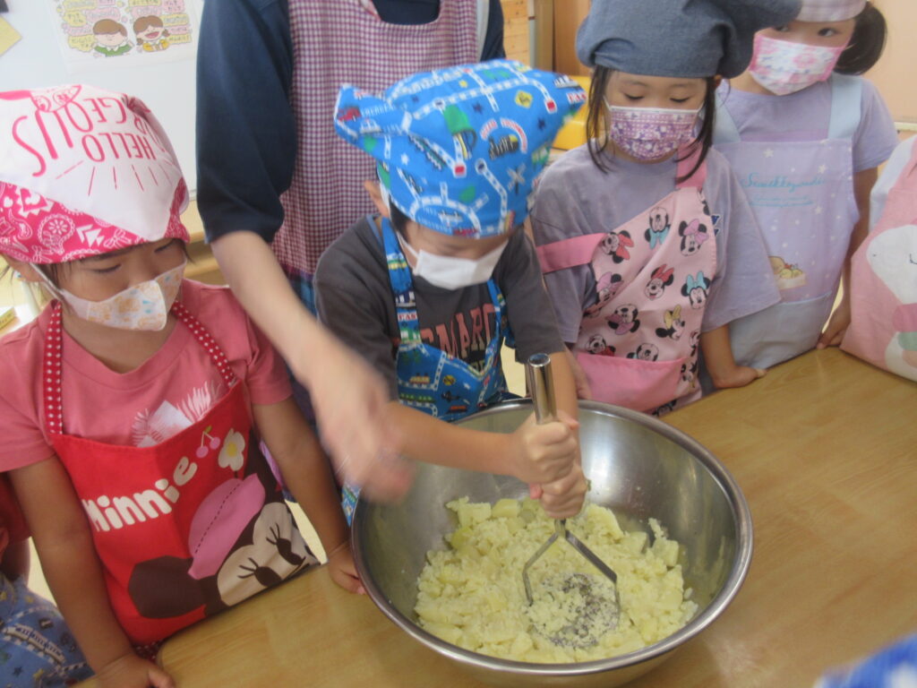 マッシャーを使用して力を合わせてじゃがいもを潰します💪1人10回を2週行いましたが、子どもたちはぜ~んぜんへっちゃらで大きな声で数を数えていました😉