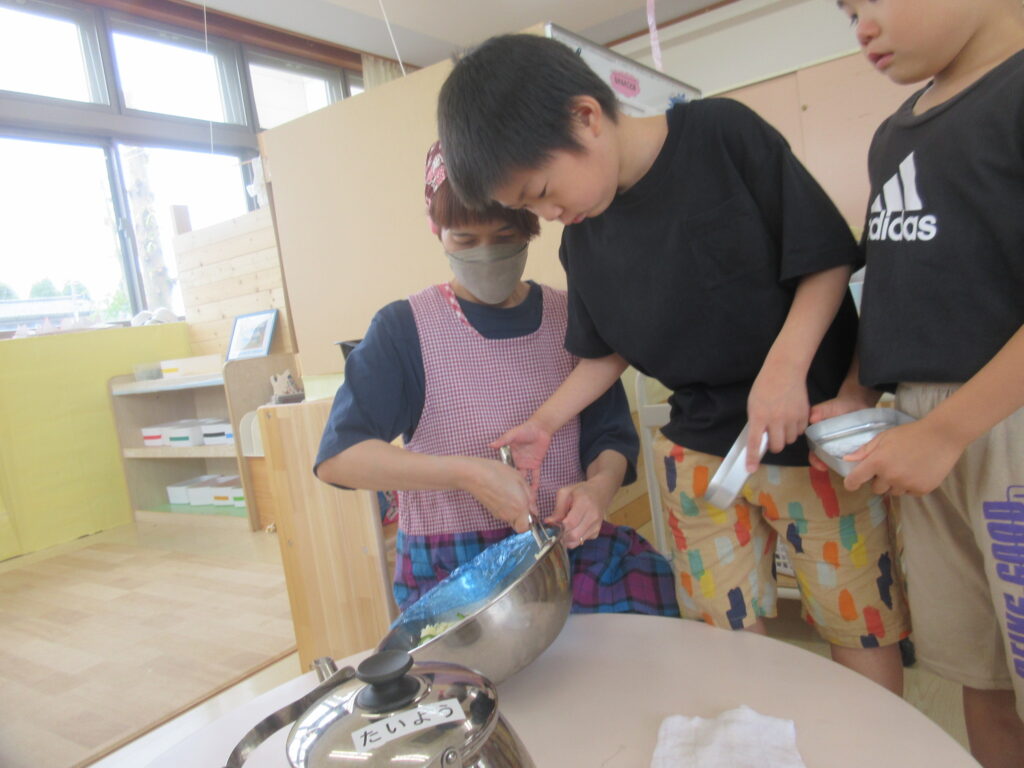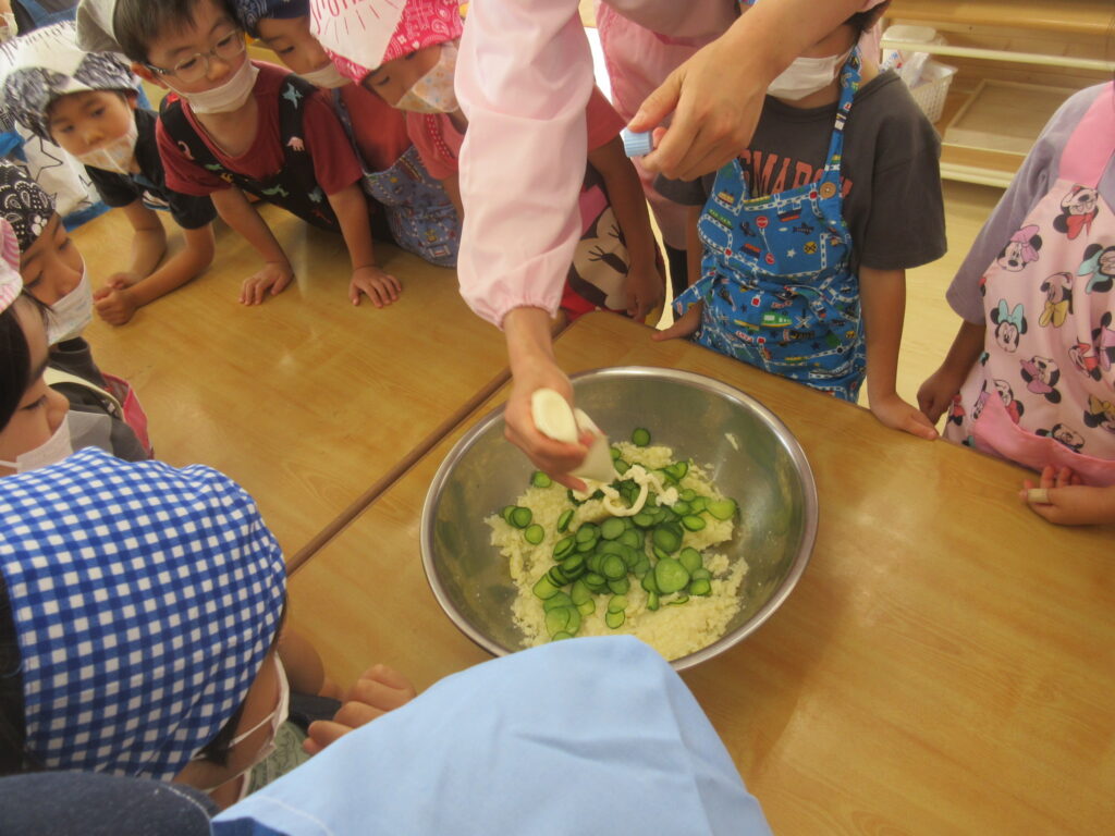 最後は給食先生にマヨドレと塩を入れてもらい、子どもたちがまた順番で混ぜ混ぜ~♪