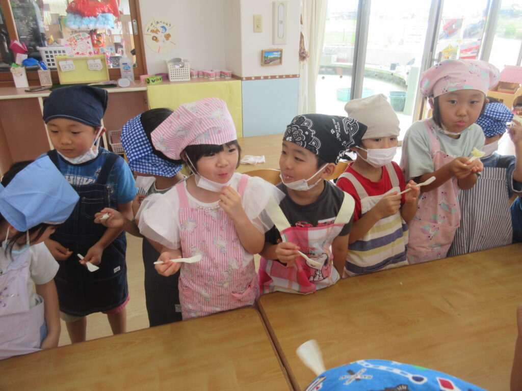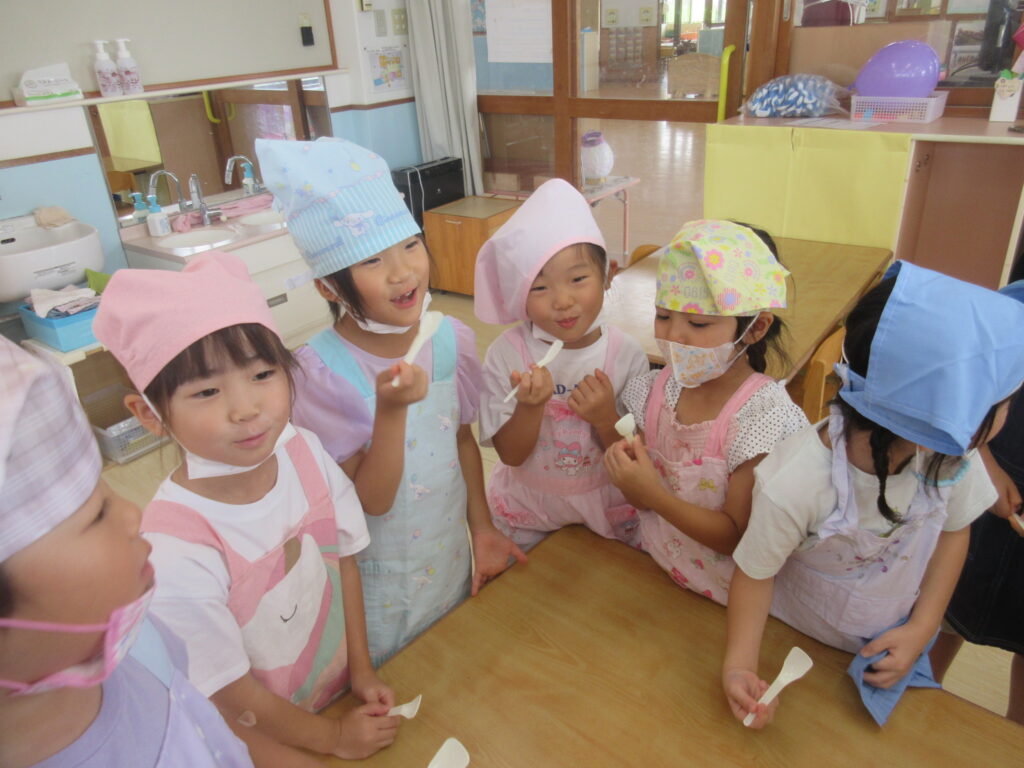 食べるとニッコリ笑顔で「おいしい!!☺」と話す子どもたち。