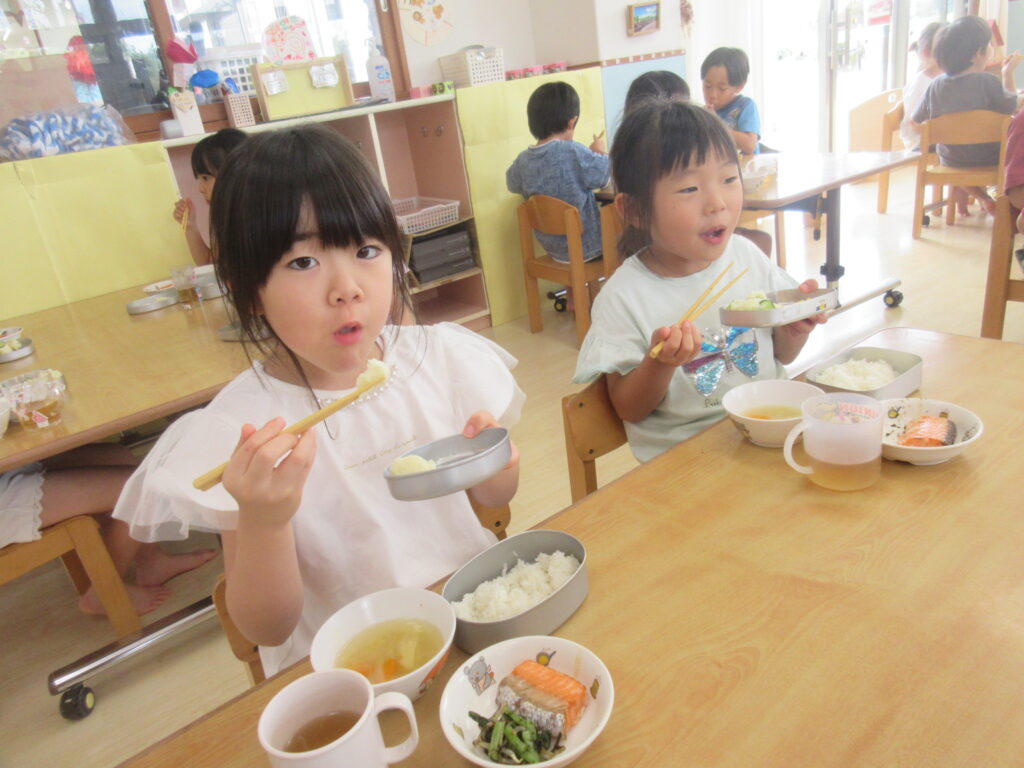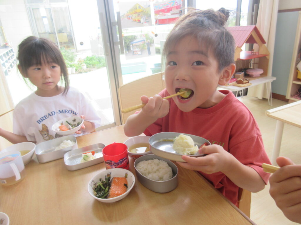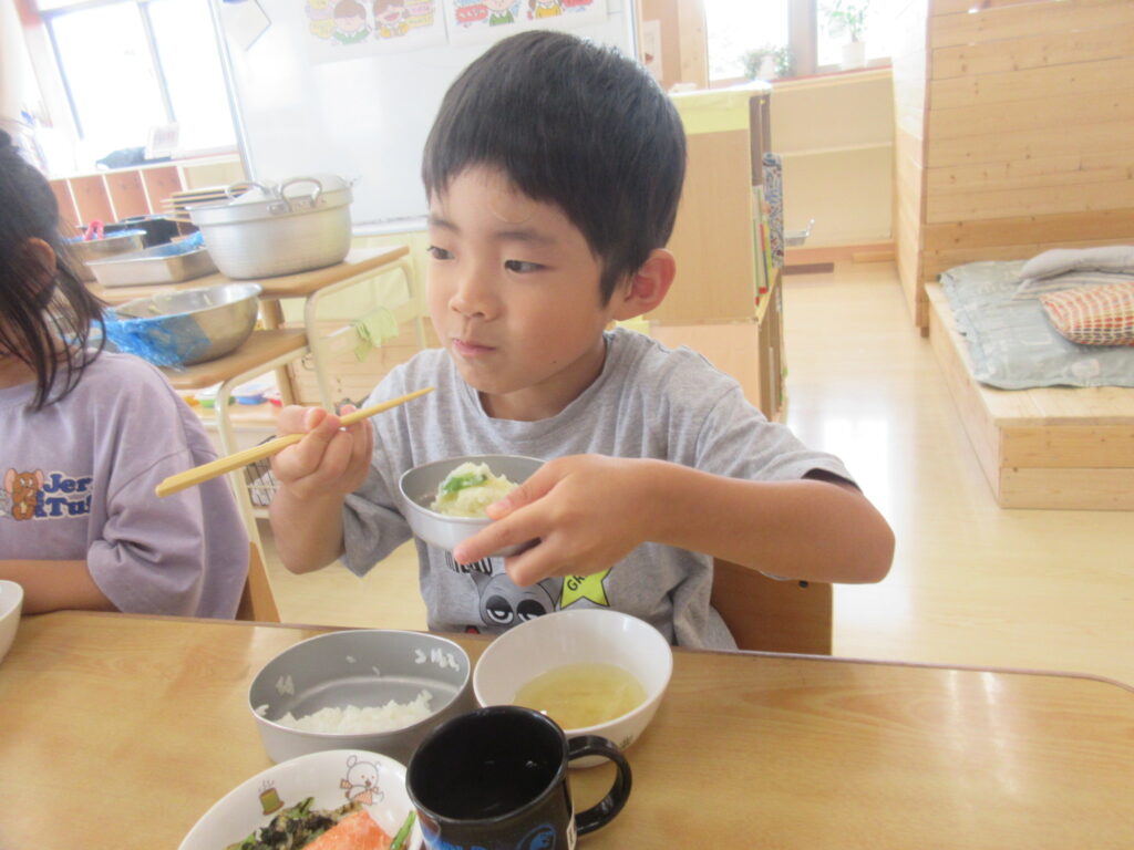 食べやすい味付けで、保育園で採れた食材のみで作ったポテトサラダをパクパクと食べ進める子どもたち。