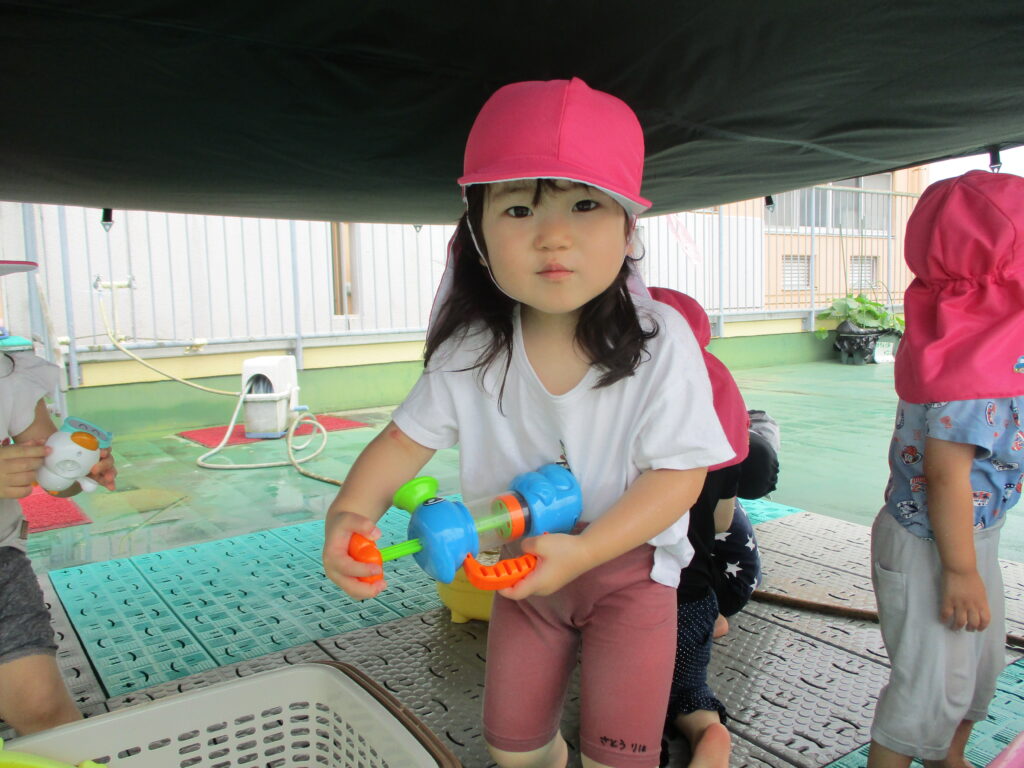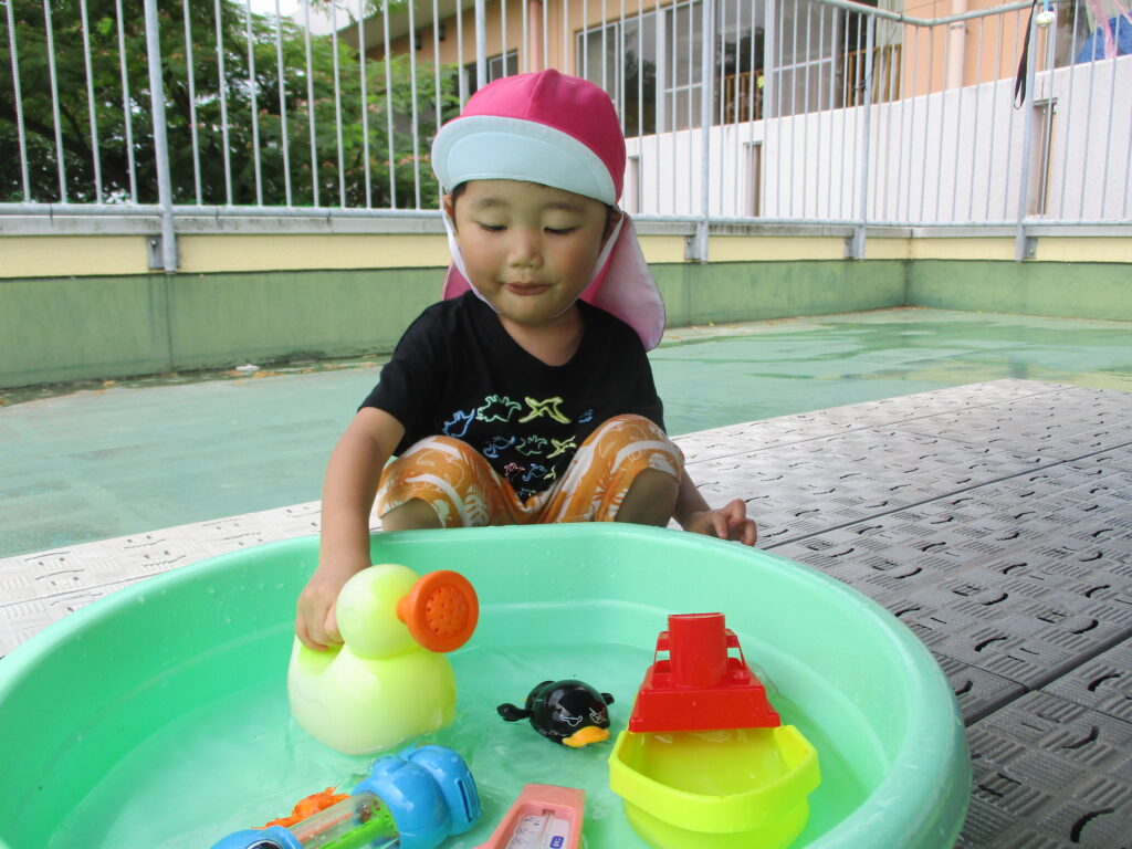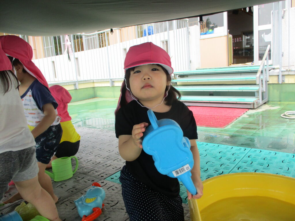 7月に入り水遊びが始まりました!暑い中で冷たい水を浴びたり、触れたりすることでとても気持ちよさそうでしたよ!