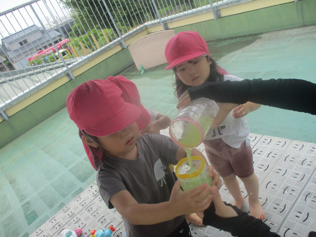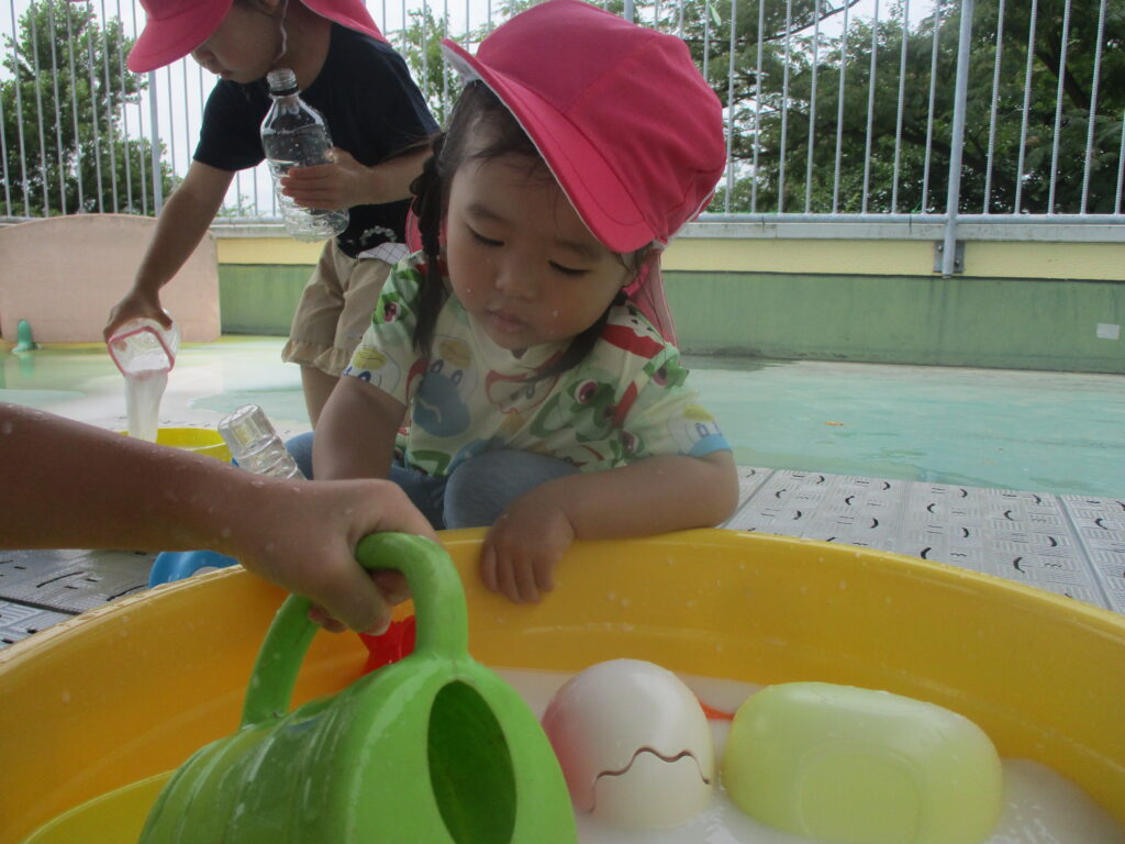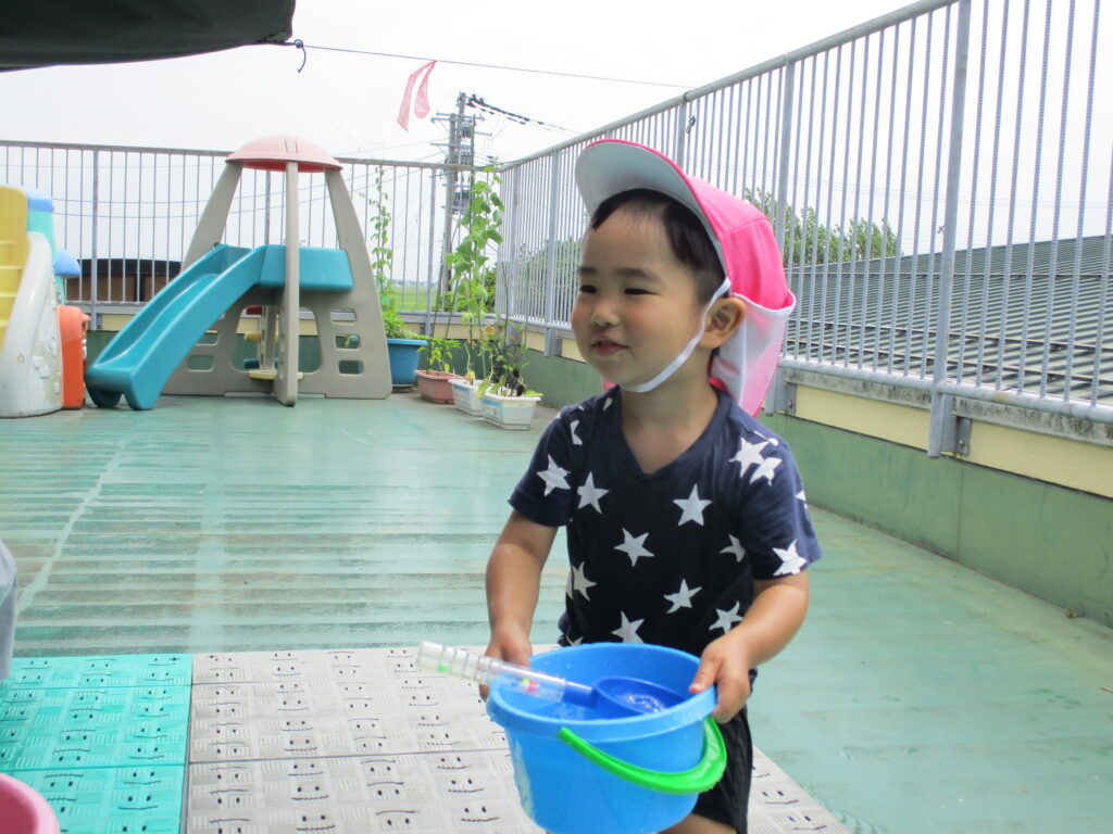水をバケツに沢山入れることが出来てとても嬉しそうな姿や、使い方を考えて悩んでいたりと様々な表情が見られました!