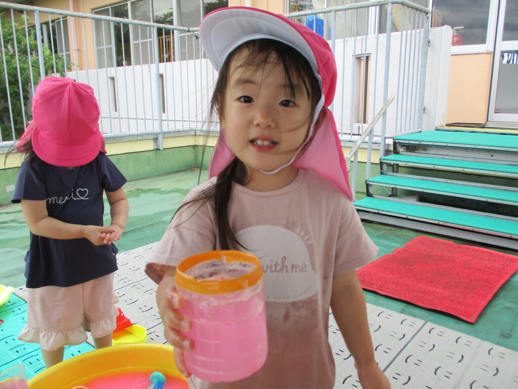 また、絵の具を使って色水を楽しみました!「カルピスー!」と嬉しそうに教えてくれたり、「いちごミルクどうぞ」とジュースにしていました。
