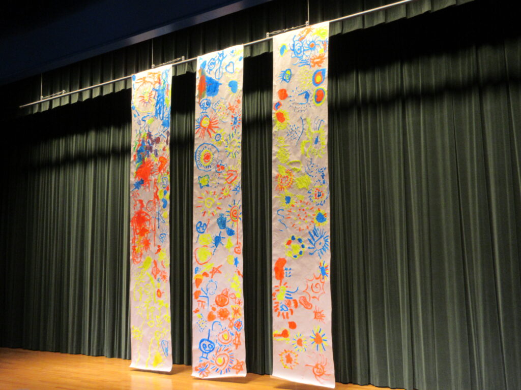 みんなの描いた絵画を棒に吊るしてみると、こんな感じに☆彡