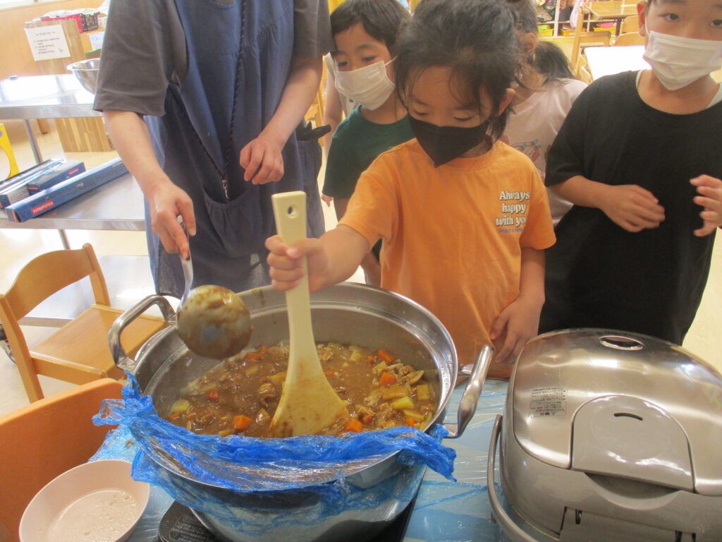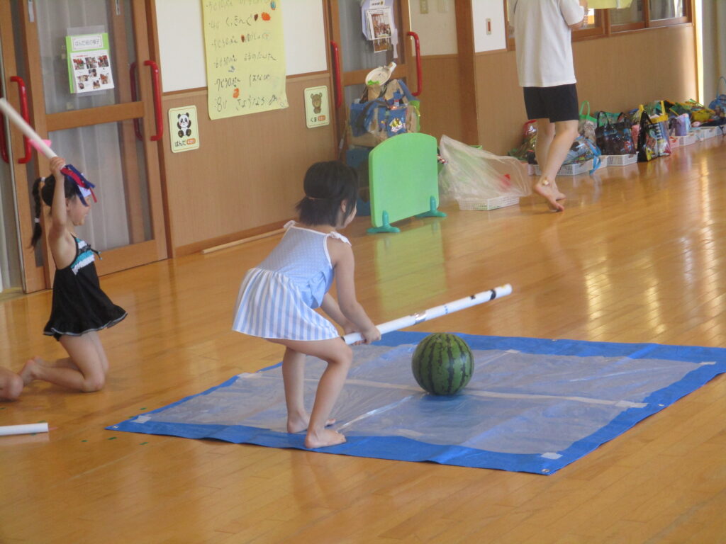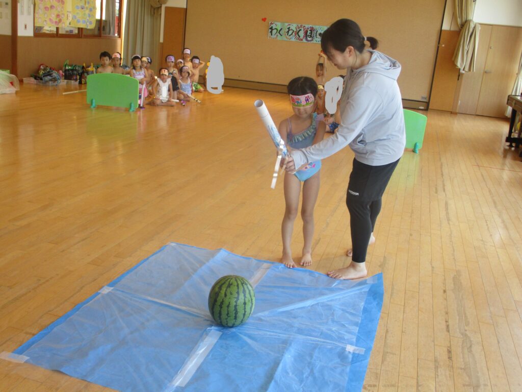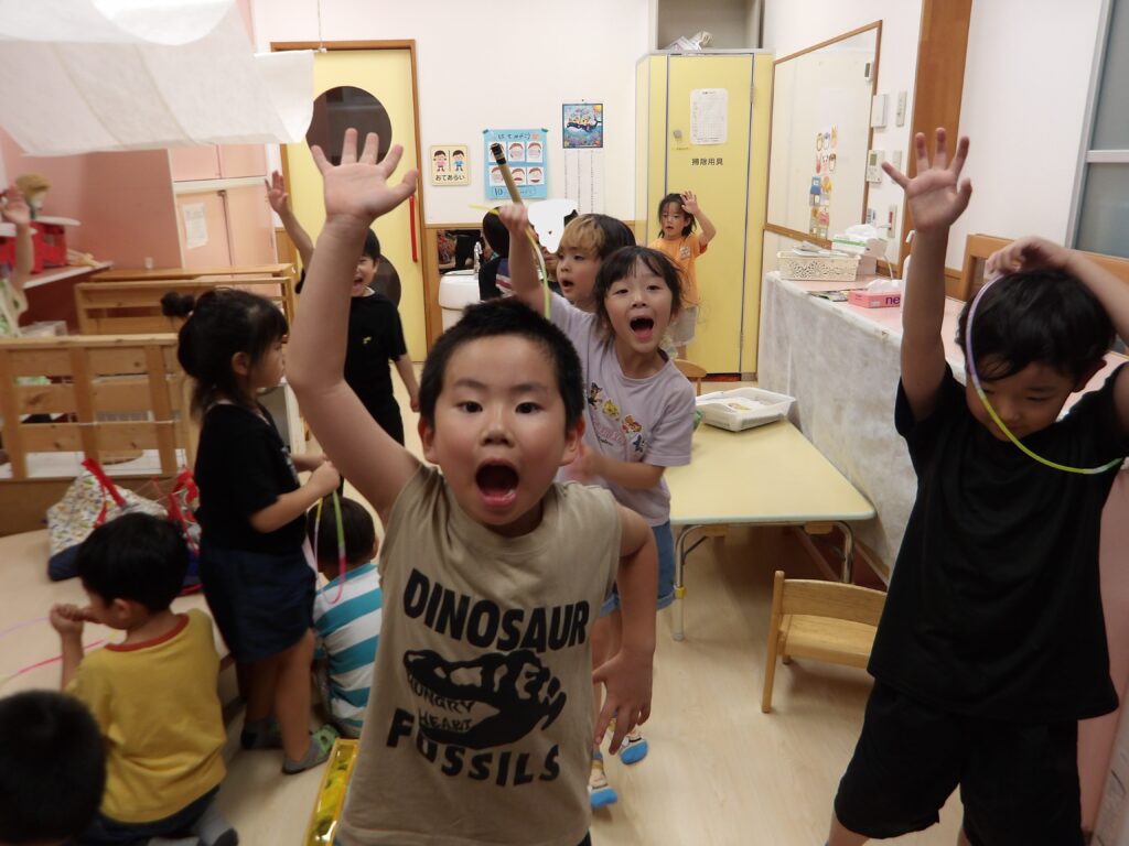 ニュース&トピックス YOUなかの保育園 ☆くま組 わくわく保育☆【YOUなかの保育園】 掲載日2025.7.22 カテゴリー保育園 くま組さんになってからこの日を一番に楽しみにしていたお友達がたくさんいました。子どもたちが『やりたいこと』をみんなでずっと前から考えて待ちに待った当日を迎えました。 まずは『スイカ割り☆』1番子どもたちから「やりたい!」といった声が多かったです。 この日のためにMyアイマスク&棒を作りました☆ みんなの声を頼りに「えいっ!」 「われたかな?」と確認中・・・ 「割れたー!!!」 「おいしーい!」 みんなで食べるスイカは格別! あっという間になくなりました☆ 次は『水遊び☆』汗を流して思いっきり楽しみました! 夕食はカレーライス!みんなでクッキングスタート☆ 「おうちで練習してきたよ!猫の手だよね」 お米も自分たちで研ぎました まぜまぜ~いい匂いがしてきたね! 美味しく出来上がりました☆ 「いただきまーす!」 いよいよ夜の保育園探検に出発☆ みんなで宝を探しに行きます! 「どこにあるかな?」 最後は『花火』みんなで「きれーい!すごーい!」と大盛り上がりでした! 花火も終わってお迎え待ちの子どもたちに「楽しかった人~?」もちろん「はーい!!!」みんないい笑顔です! 子どもたちが意見を出し合いながらみんなで考え作り上げた『わくわく保育』は大成功!普段とは違う特別感を感じながら、楽しい思い出ができました☆