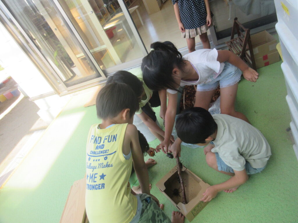 と、ここで終わらないのがたいよう組。なんと放していたカブトムシがカラスに持って行かれる事件が同時に発生しました。