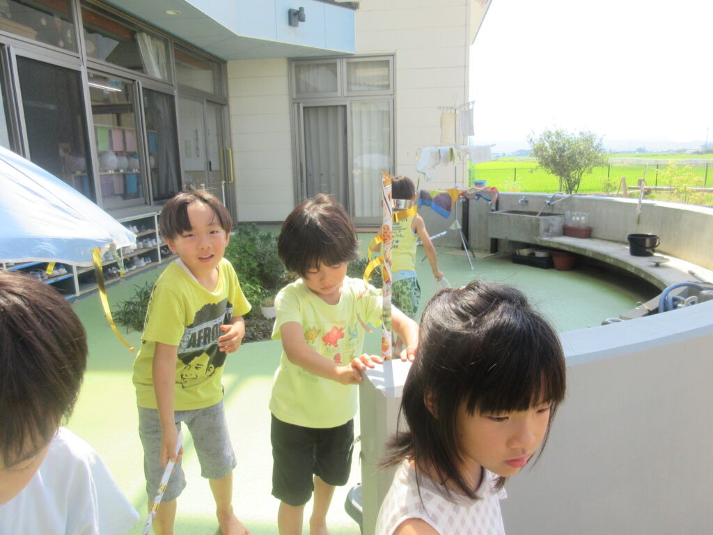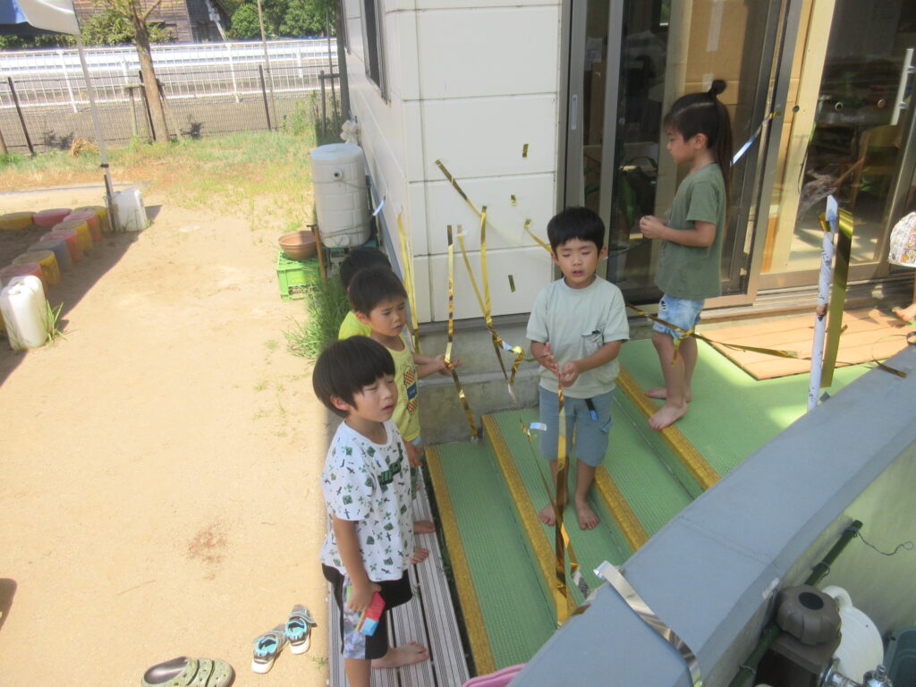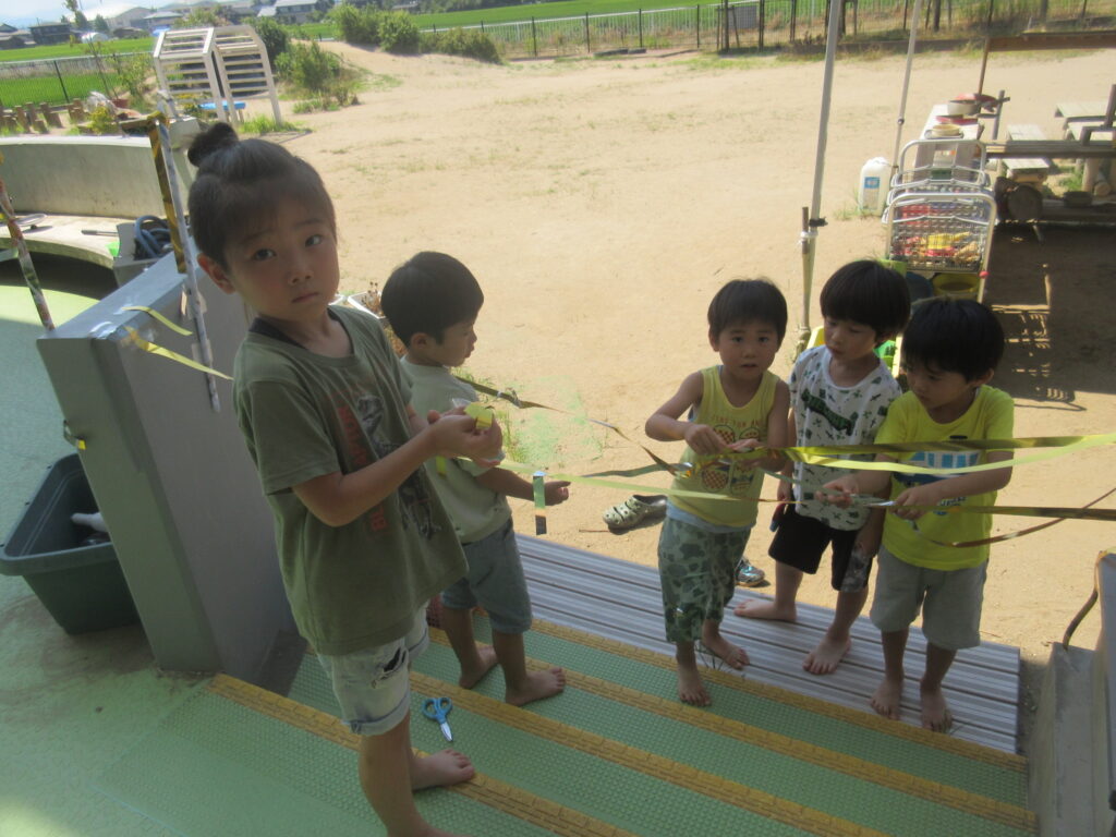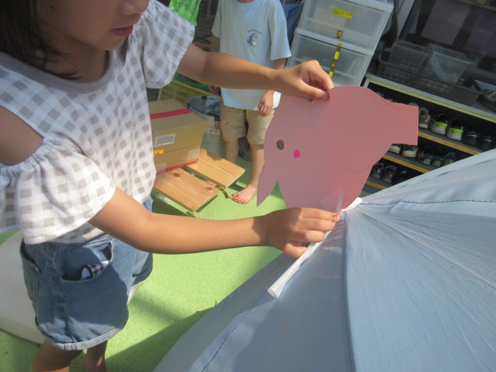 「カラスを追い払う!!」とキラキラのテープなどの材料を集めて、棒に貼ってみたり、傘に貼ってみたり