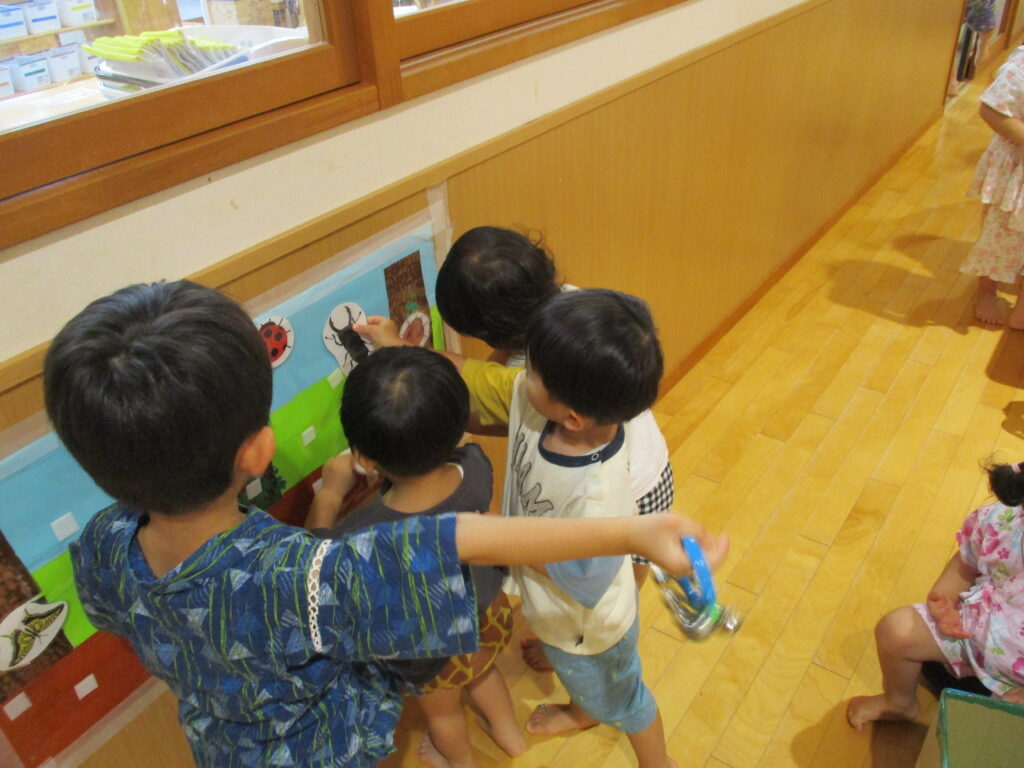 虫探し屋さんで、虫を探してボードの好きな所にペタッと貼って楽しんでいましたよ♪