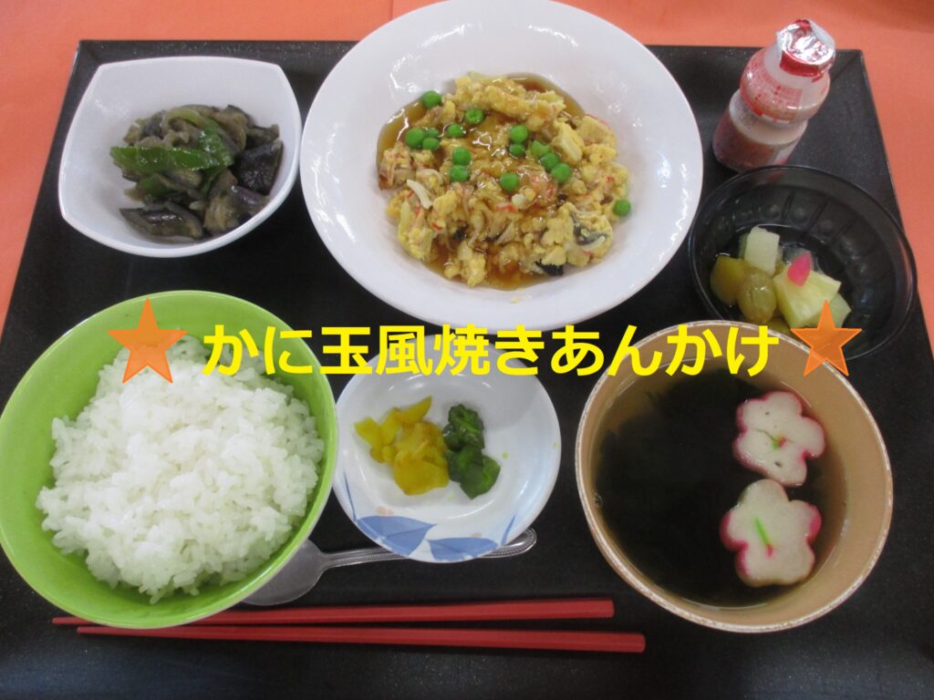 カニ風味焼きあんかけ 茄子の味噌炒め ご飯 すまし汁 漬物 果物🥝🥝🥝