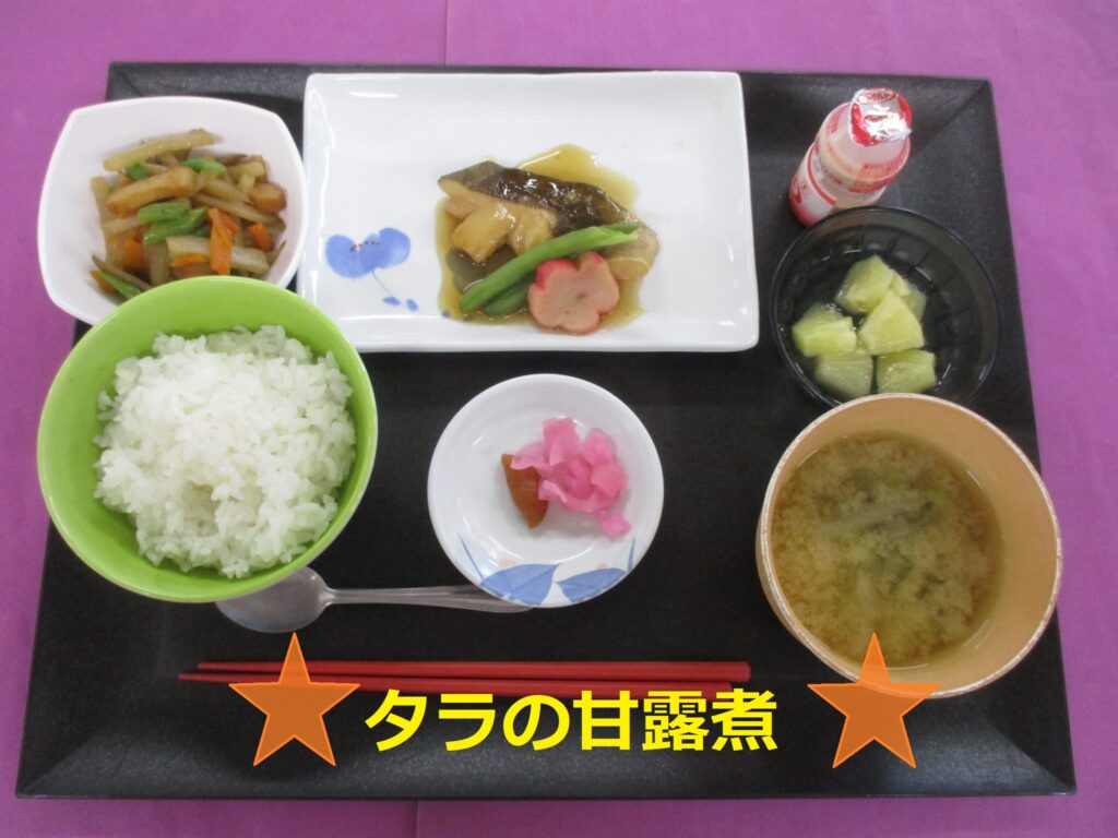 タラの甘露煮 金平ごぼう ご飯 味噌汁 漬物 果物🥭🥭🥭