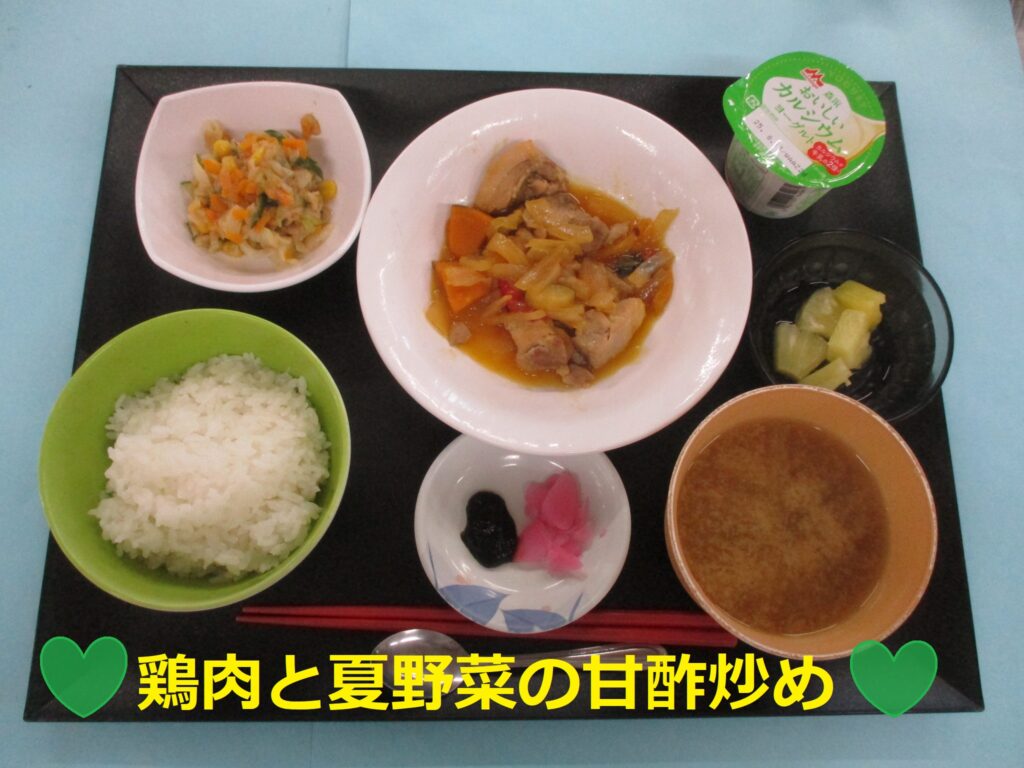 鶏肉と夏野菜の甘酢炒め キャベツの和え物 ご飯 味噌汁 漬物 果物🍒🍒🍒