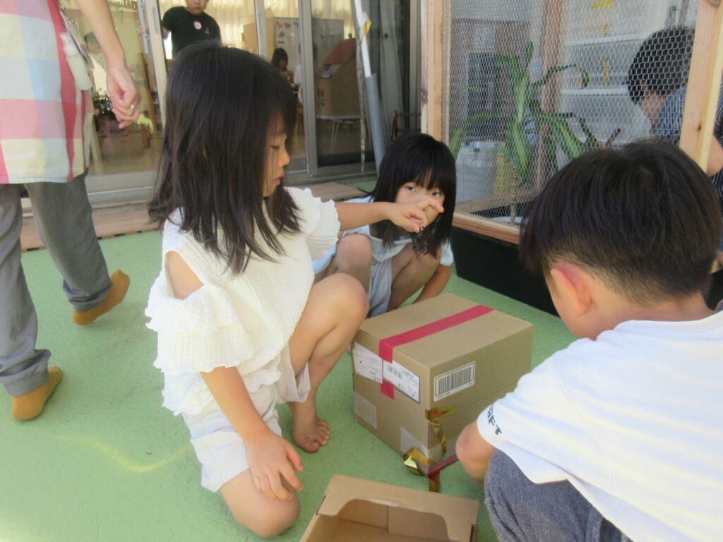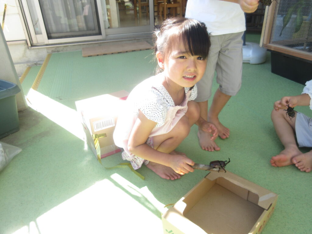 このような機会を通してしばらくたったある日。「さわれない~😞」というお友だちに対して「こうやって持つんだよ!」「ここ持ってみて!大丈夫でしょ??」と優しくカブトムシの捕まえ方を教え合う姿が見られました😉