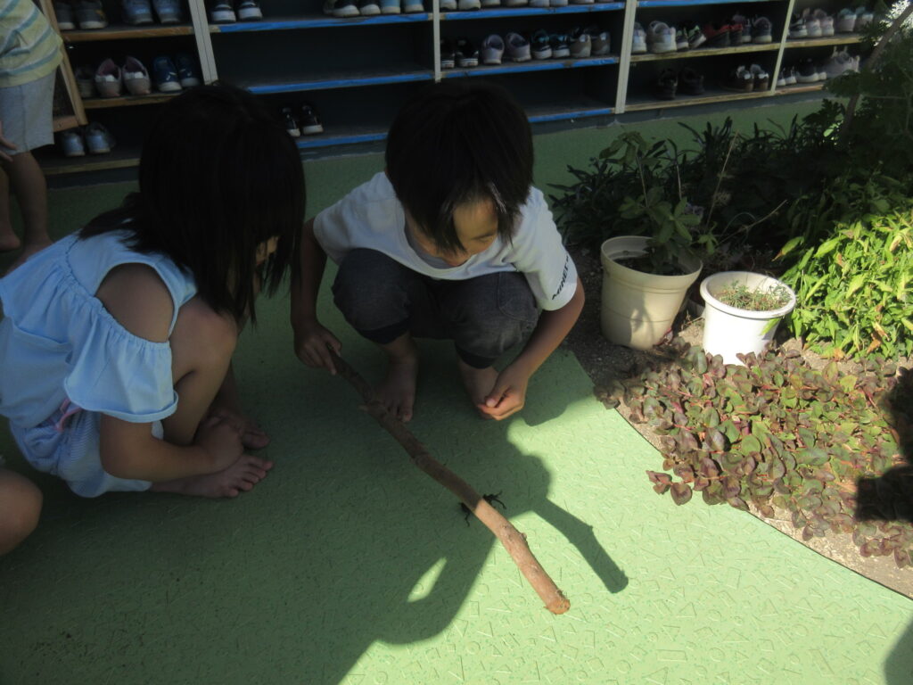 興味はありますが、カブトムシが少し苦手だよ~ってお友だちは枝にのせて観察をしたり