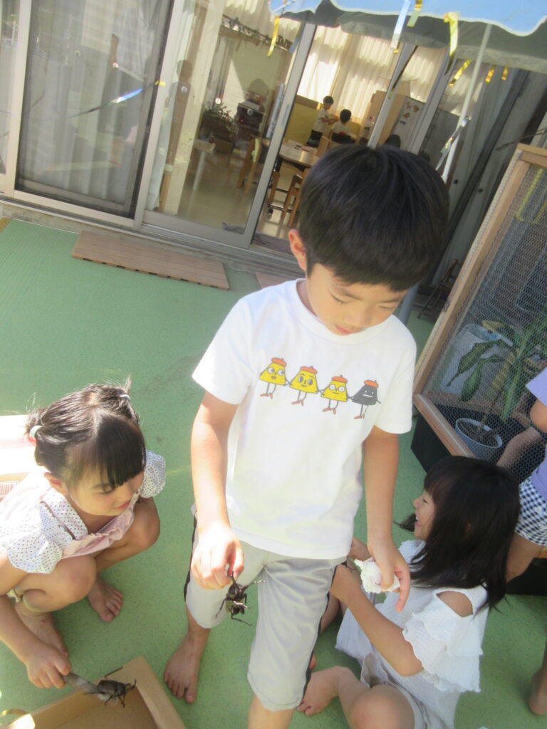 子どもたちはカブトムシとの触れ合いを楽しんでいます。