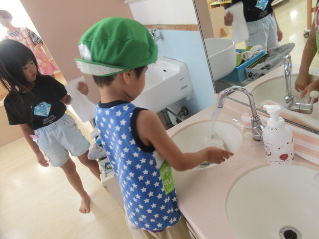 アトリウムに出る際には足拭き用に濡らした雑巾と空雑巾を用意したり、こぼれた土はほうきで集めたりと遊びや好きな活動の中にも子どもたちが身のまわりの事や活動のための準備などを少しずつ出来るように取り入れています。