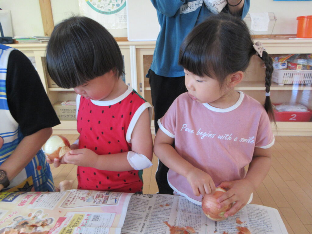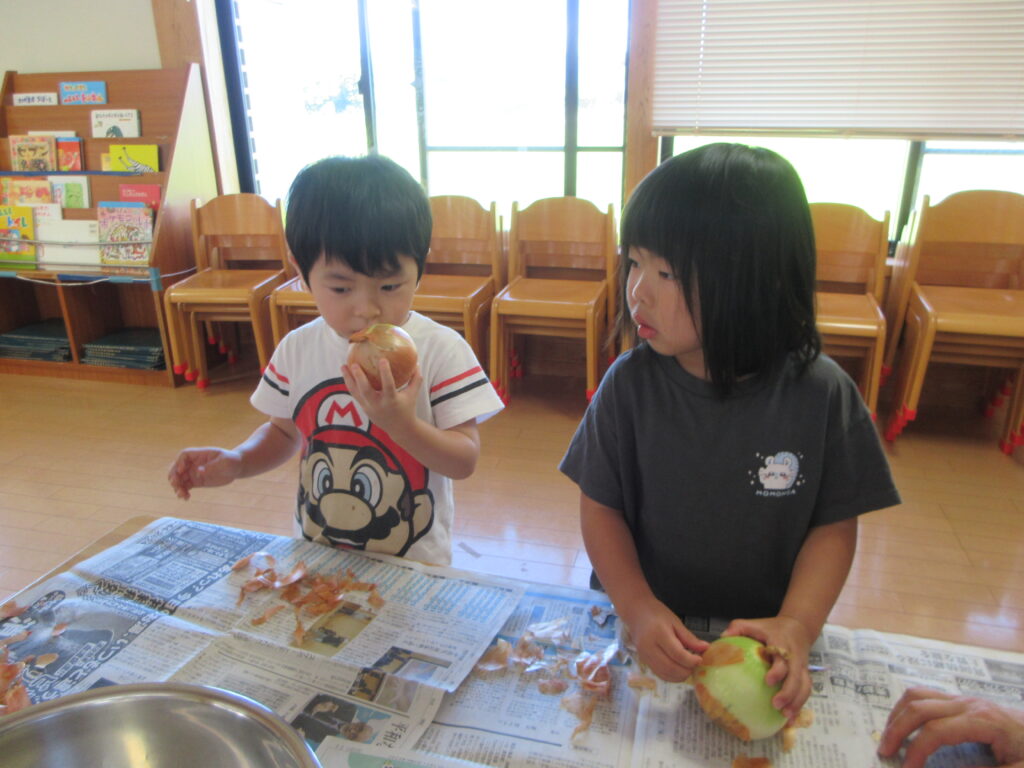 皮むきの途中で「目が痛くなってきた…」というお友だちもいました。