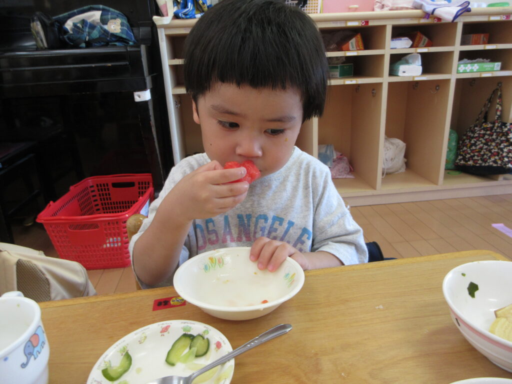 今日の給食のデザートにはスイカが出ました!みんな「おいしい!」「あまい!」と言っておかわりをしていました。