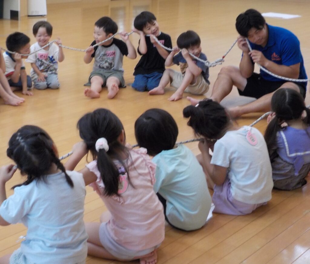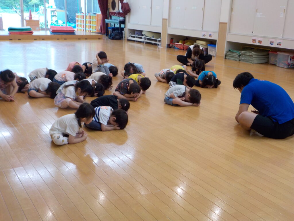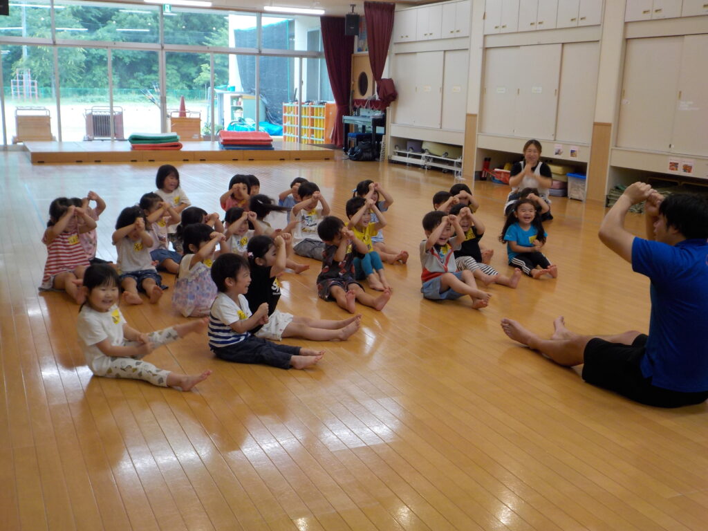 体操教室では、ほし・つき・たいよう組の子どもたちが体操の先生の指導の下、広いホールで友達と一緒に体を動かす楽しさや心地良さを感じることができました。