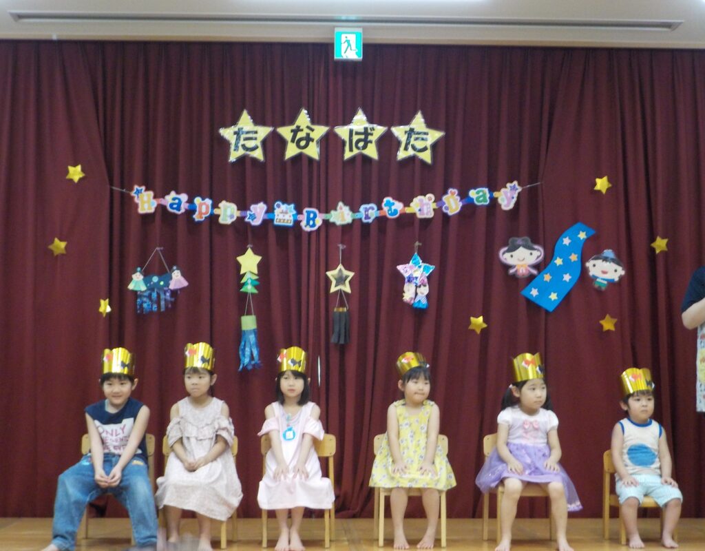 七夕誕生会では、7月生まれのお友達をみんなでお祝いをしたり、先生たちの寸劇を通して七夕の由来に触れたりしました。