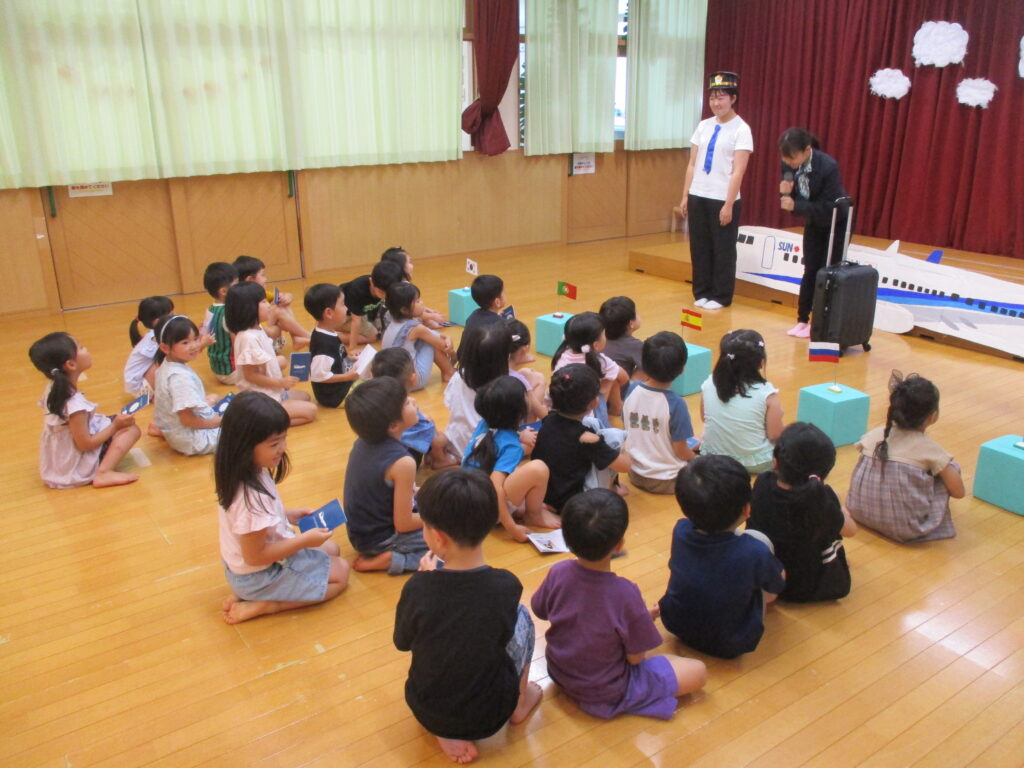 7月19日には”たいようスペシャルデー”がありました。今回は”世界”旅行をテーマとして、飛行機に乗って色々な国を訪問し、各国で楽しいこと(ハワイでは水遊び、中国で餃子づくり、ドイツやイタリアでは謎解き・・・等々)を経験しました。その国ならではの挨拶や言葉に触れたりと、とても楽しい1日となりました。