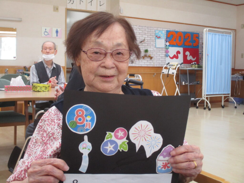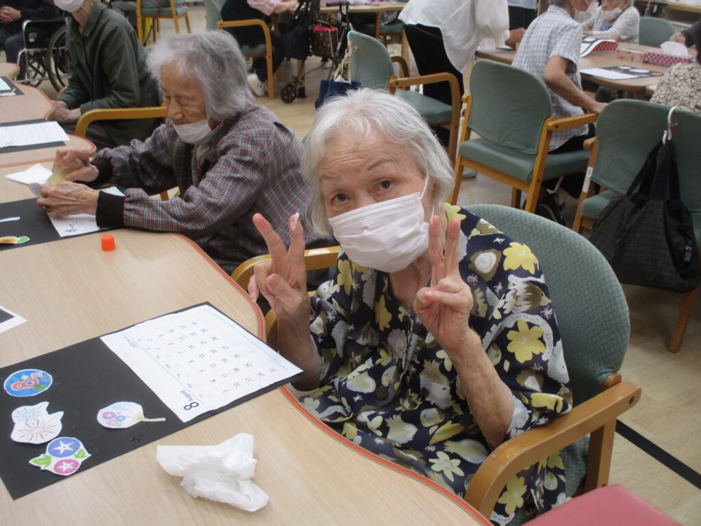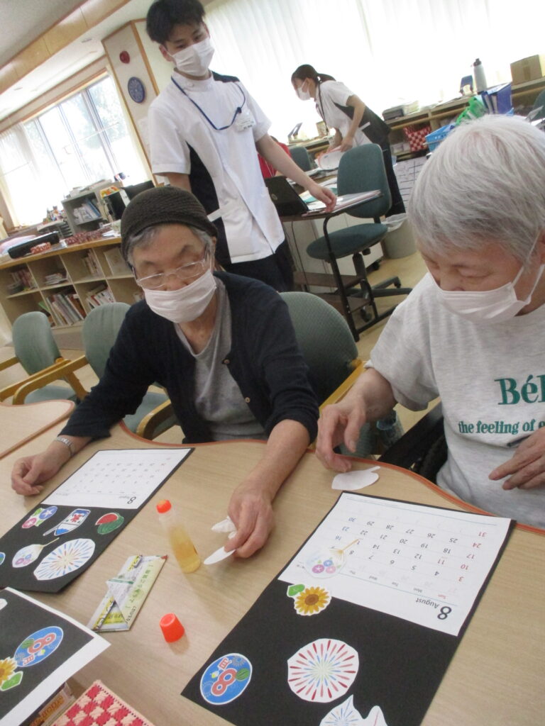 毎月カレンダーを作っています。色々な季節の風物詩を使って見本を見ながら作ったりご自分の好きなように作ったりして思い思いに作っていました🎆🎇