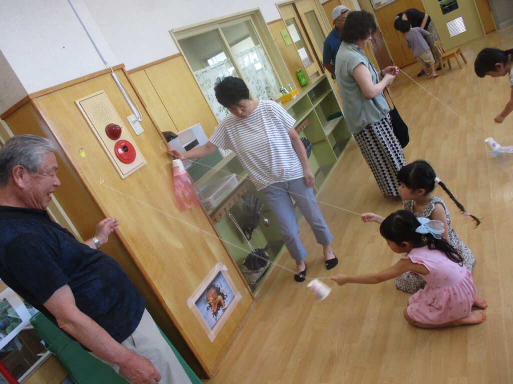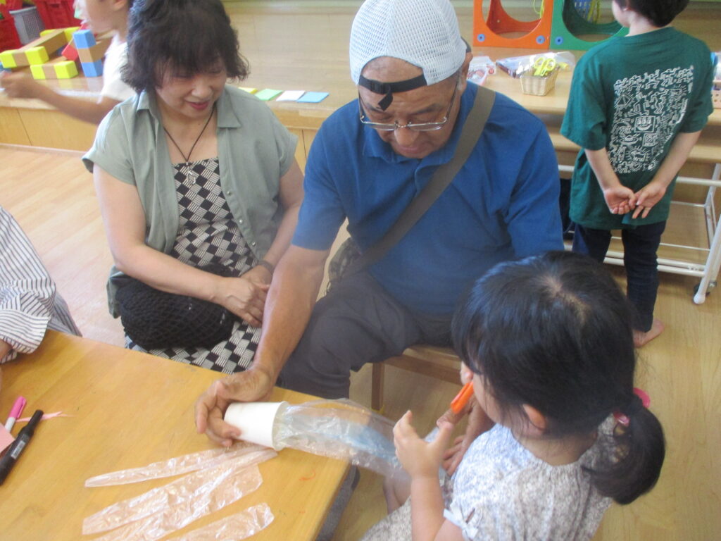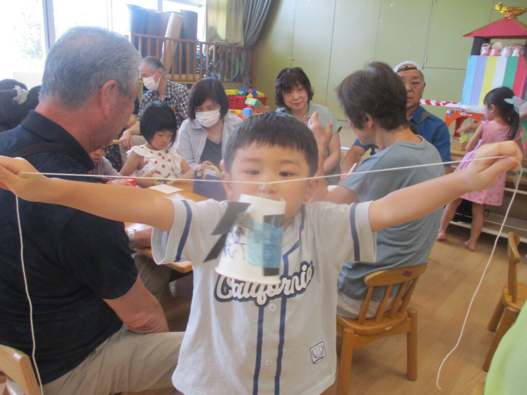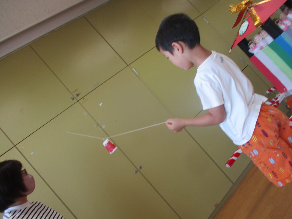 製作遊びで紙コップのロープウェイを作っています。