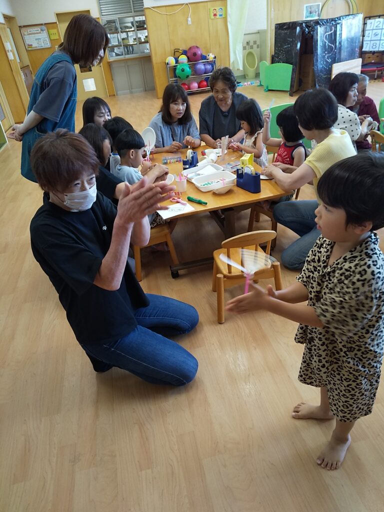 さっそく作った物で遊びました。さすがおじいちゃん、おばあちゃん!すぐにコツを掴んで「こうしたらもっと跳ぶかも!」とやり方を優しく教えてくれて子どもたちもさらに遊びに夢中になっていました。