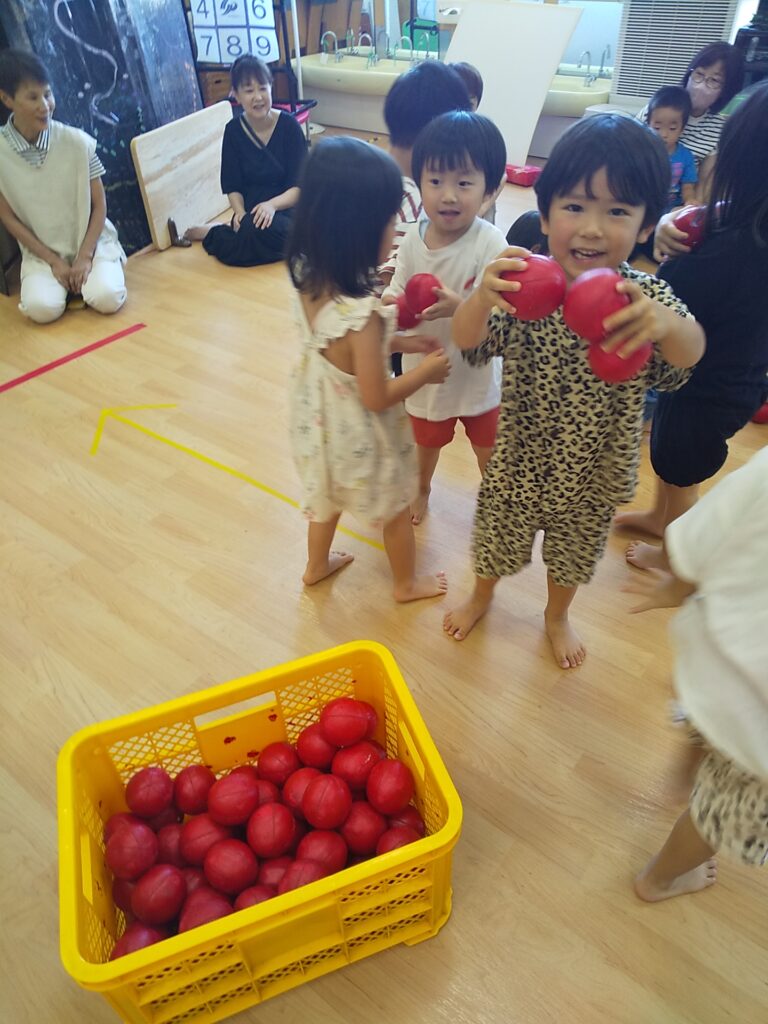 次にしたのは普段の遊びの中で人気の玉入れ競争!今回は競い合うのではなく、みんなで力を合わせて何個入るか!に挑戦しました。目標は15個だったのですが、おじいちゃん、おばあちゃんの力を借りてなんと27個も入りました!とても大喜びのりんご組さんでした。😆♪