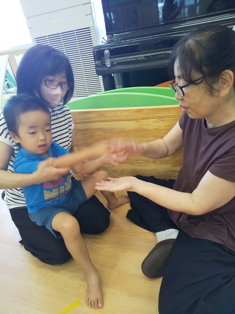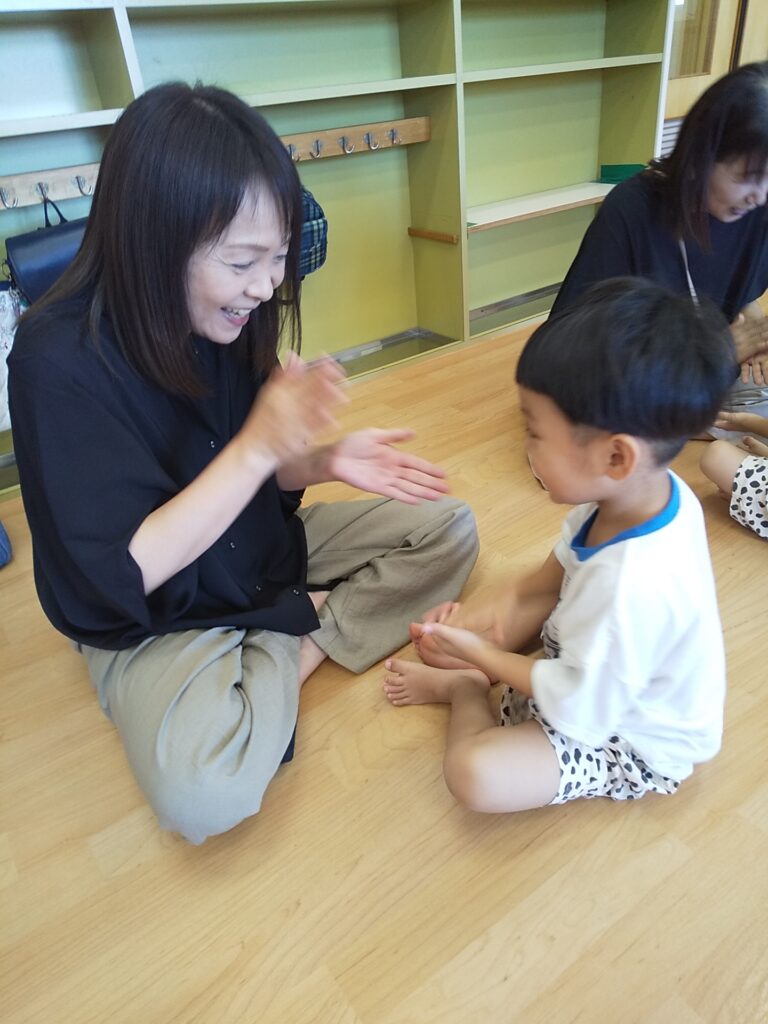 最後に触れ合い遊びをしました。「おてらのおしょうさん」では、目や手を合わせて触れ合う姿が心温まるゆったりとした時間となりました。じゃんけんに負けないぞー!と盛り上がる場面も見られました。