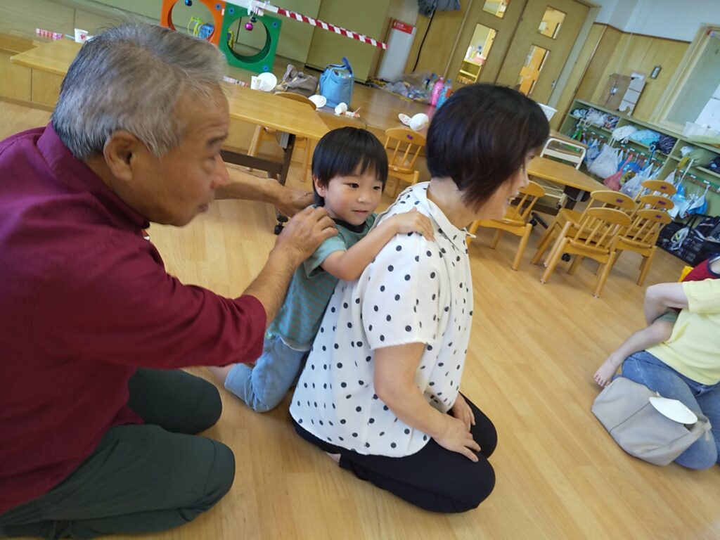 日頃のおじいちゃんおばあちゃんの疲れを癒そうと、もみもみマッサージタイム★トントンしたりこちょこちょしたりと笑顔溢れる楽しい時間となりました。