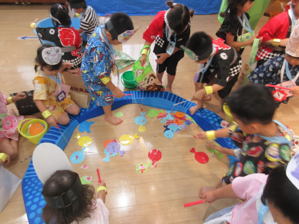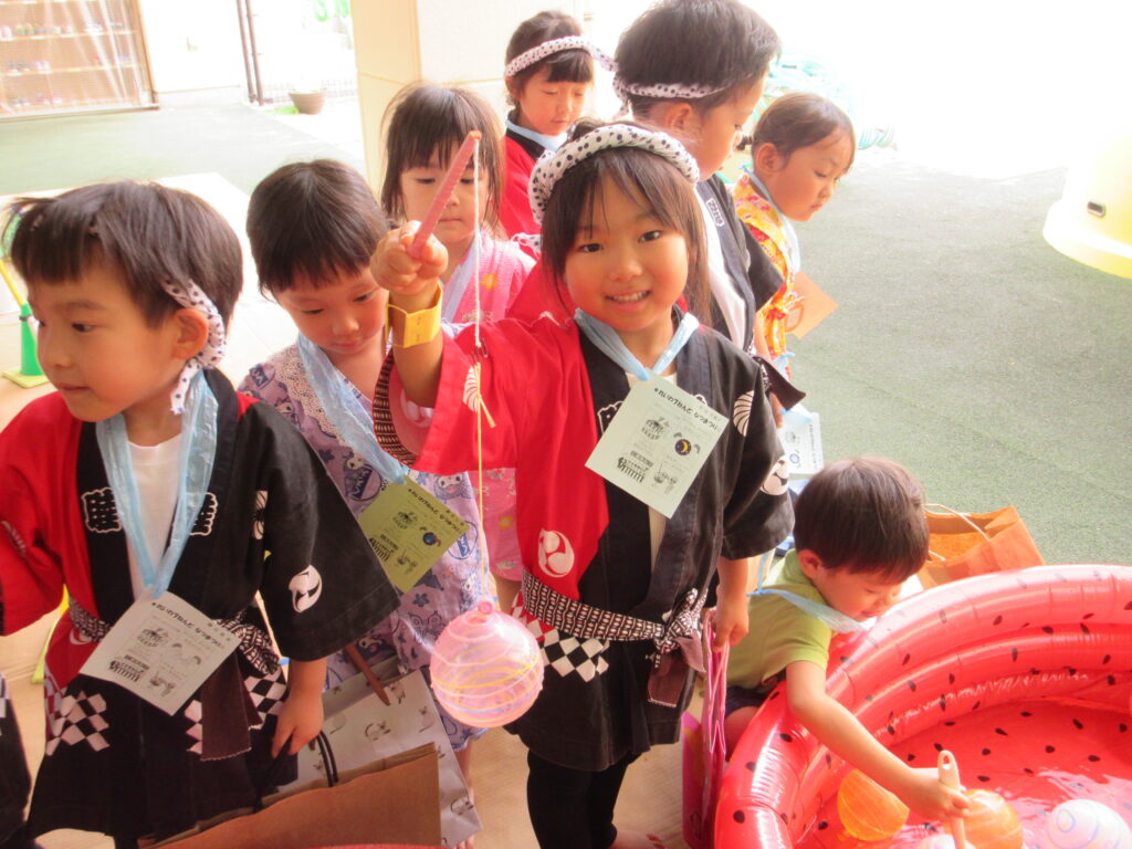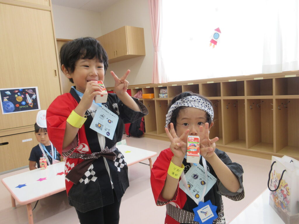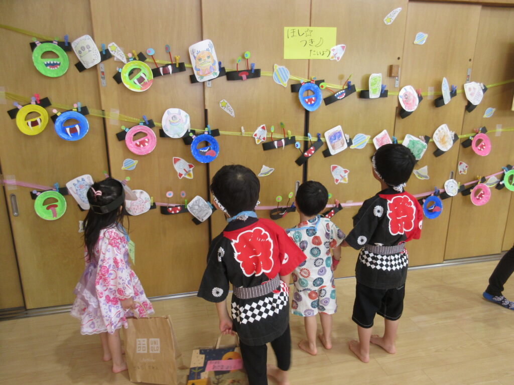 夏の一大イベントなつまつり!今年のテーマは「10周年だよ!~コスモスまつり~全員集合!!」。各コーナーコスモス(宇宙)にちなんだ装飾や内容で雰囲気が高まりました♪たいよう組さんのオープニング「爽涼鼓舞」でスタート!0・1・2歳児は先生たちと、3・4・5・歳児は異年齢でペアを組んでコーナーをまわりました☺️